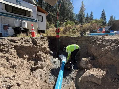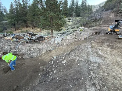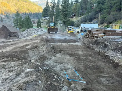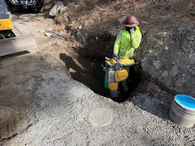 The image shows trenching activity along a dirt road in a mountainous area. An excavator is positioned on the left side, actively working on a trench, which is marked by several traffic cones for safety. The surface appears to be a mix of gravel and exposed soil. The sky is clear, indicating pleasant weather conditions. The road ahead appears to be open and not congested.