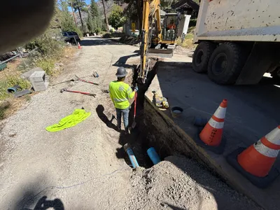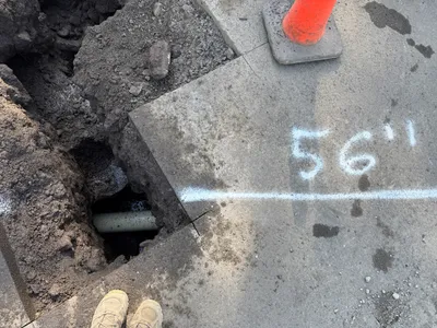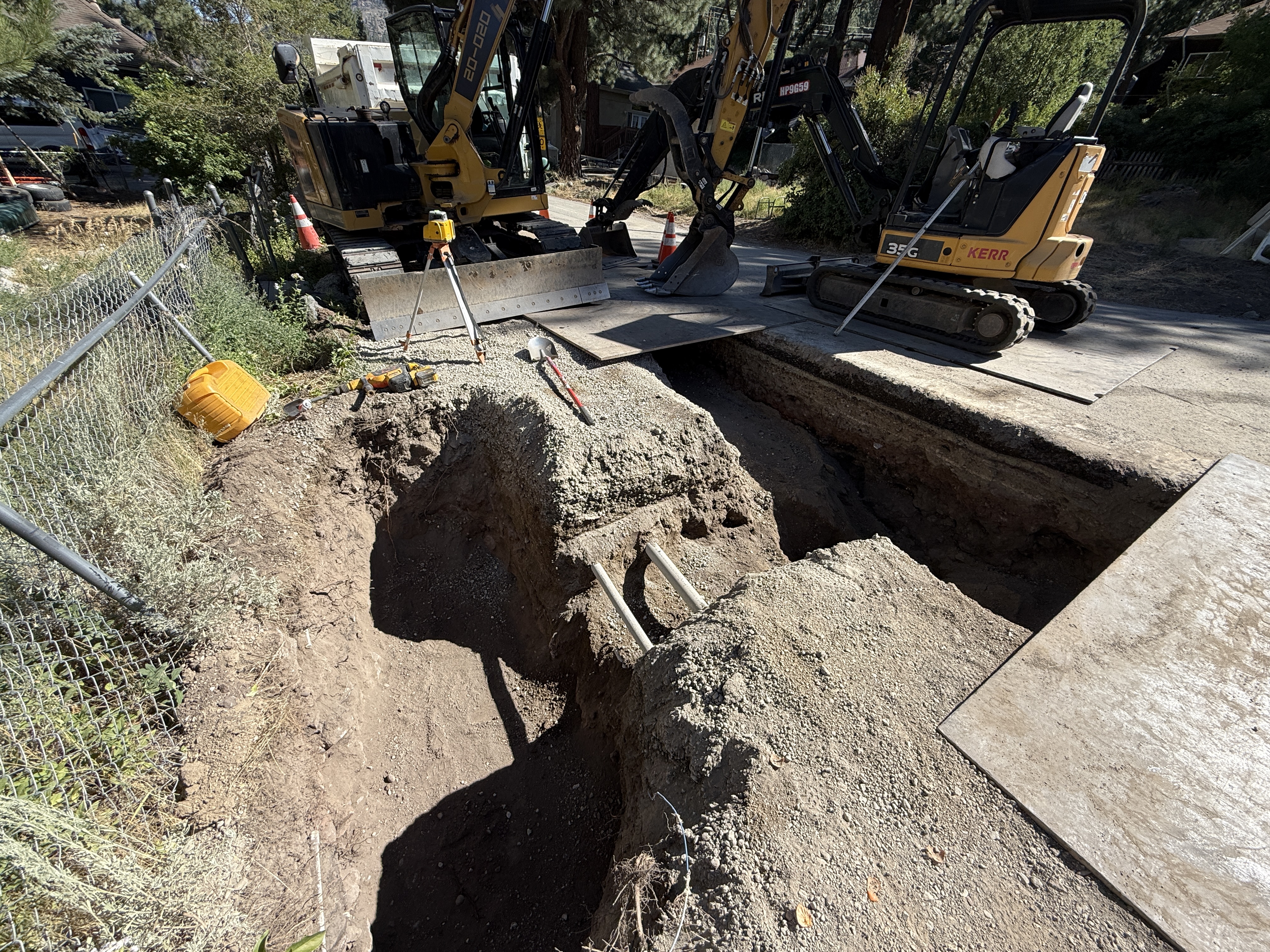 exposed soil and pavement near trench sunny with clear daylight ample space for equipment