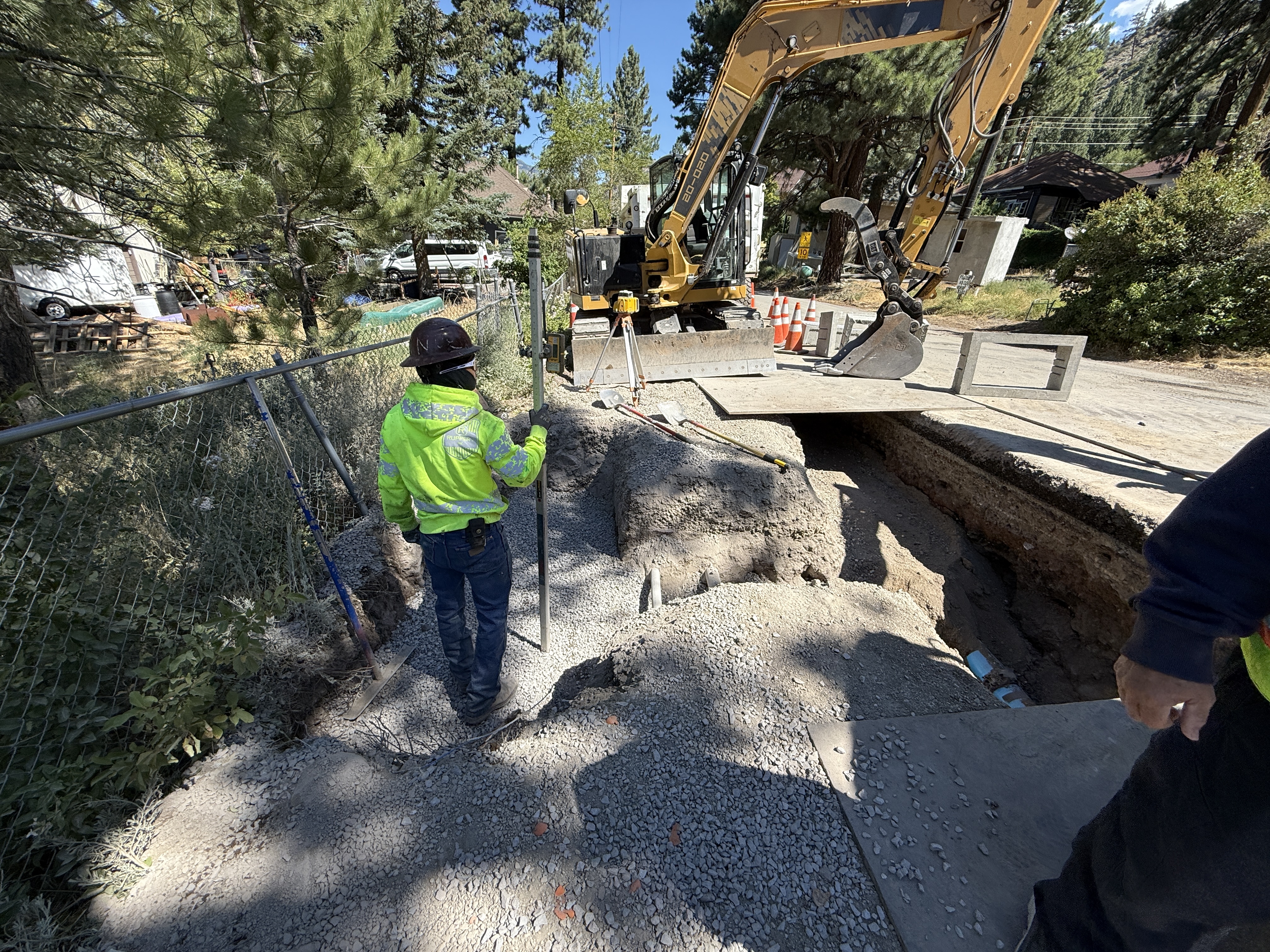 The image shows a worker holding a survey pole next to an open trench, indicating survey layout activities. An excavator is positioned above the trench, and there is loose gravel on the ground. The surrounding area includes cones and fencing for safety. Some pipes are visible within the trench.