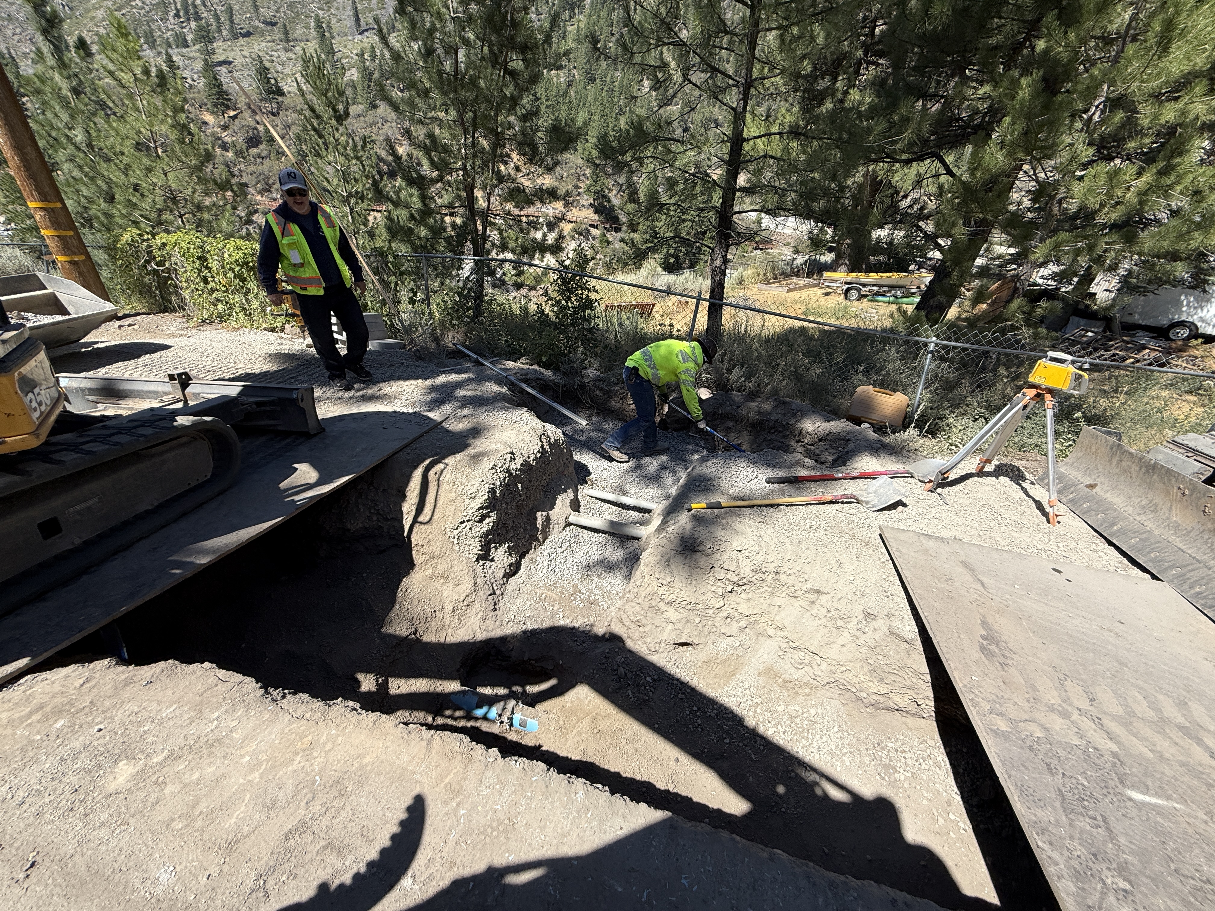 A worker in a hi-vis vest and hard hat uses a shovel near a trench. Another person stands nearby, monitoring the activity. The site shows excavation with an excavator partially visible. A tripod survey instrument is set up near the edge, suggesting layout or measurement work. The ground is uneven with gravel overlaying exposed earth.