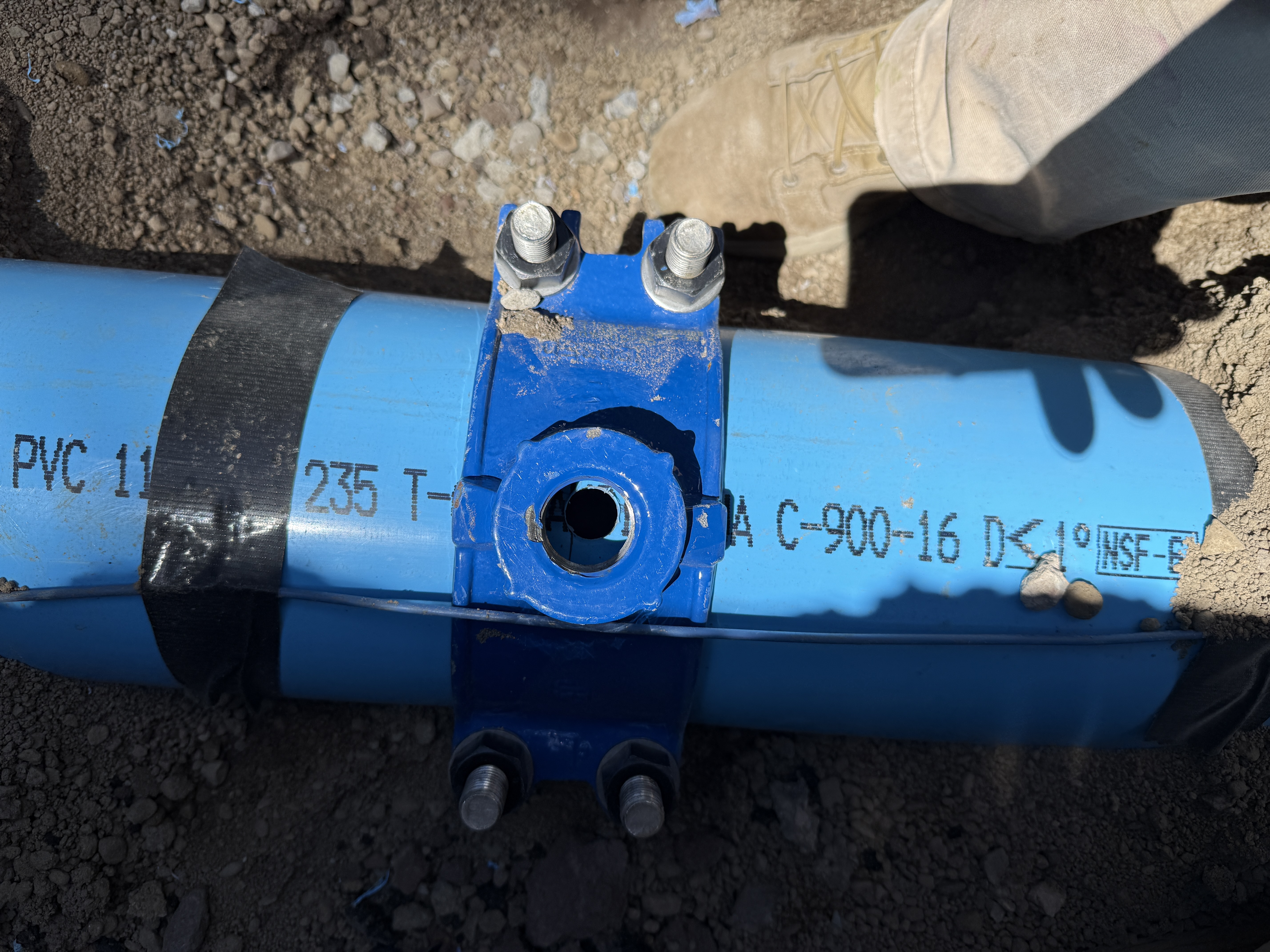 The image shows a section of blue PVC pipeline being worked on in a trench. It features a metal saddle clamp fitted onto the pipe, secured with bolts. The environment is a dirt trench with a visible section of the worker's boot nearby. This suggests pipeline installation or maintenance work is taking place.