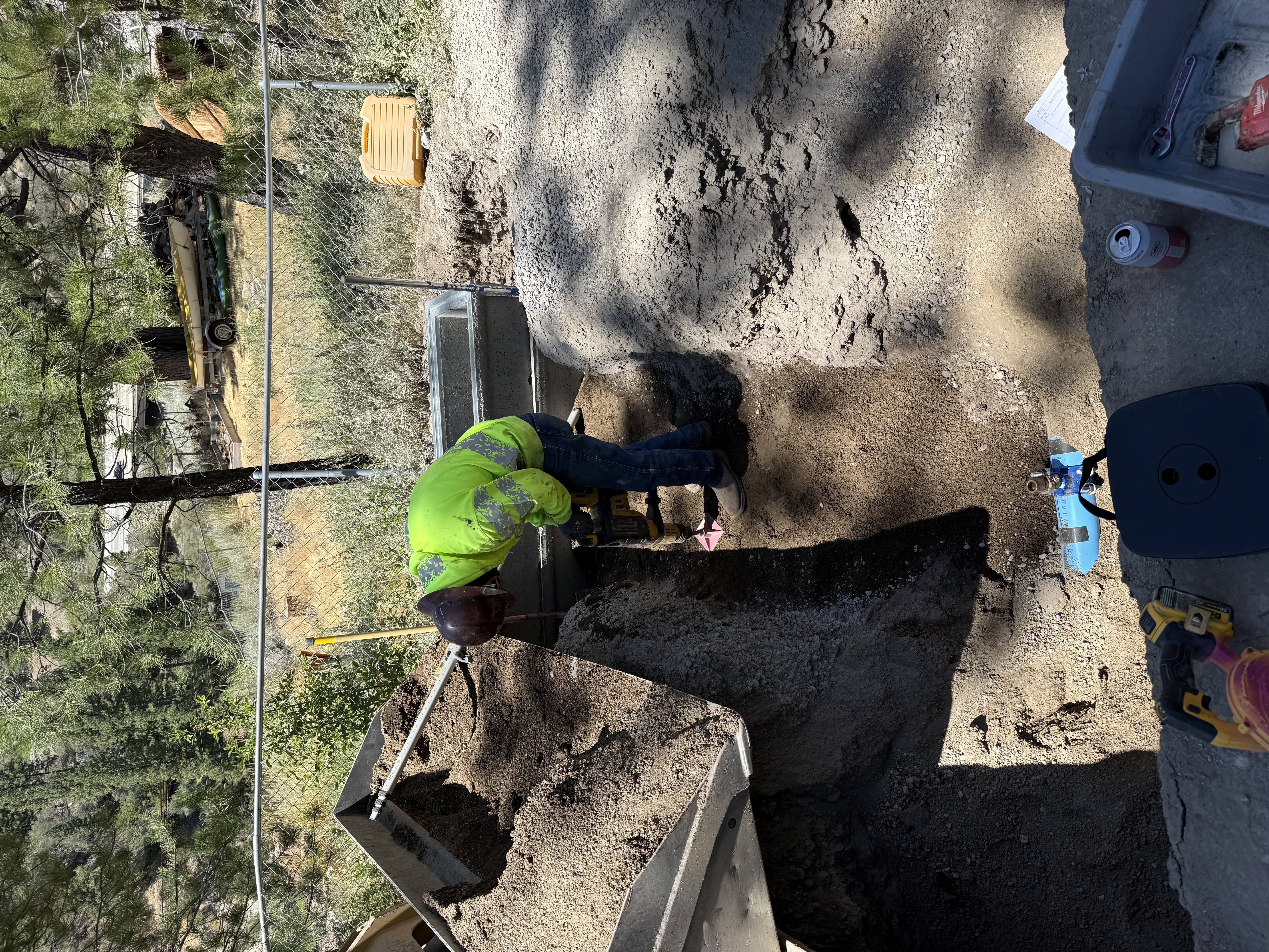 A person in a high-visibility jacket and hard hat is using a power tool within a trench. Soil is being moved from an adjacent pile, and a structural component or pipe might be partially visible at the bottom of the trench. The surrounding area includes fencing and nearby equipment laydown. The work appears to be related to trenching or excavation.