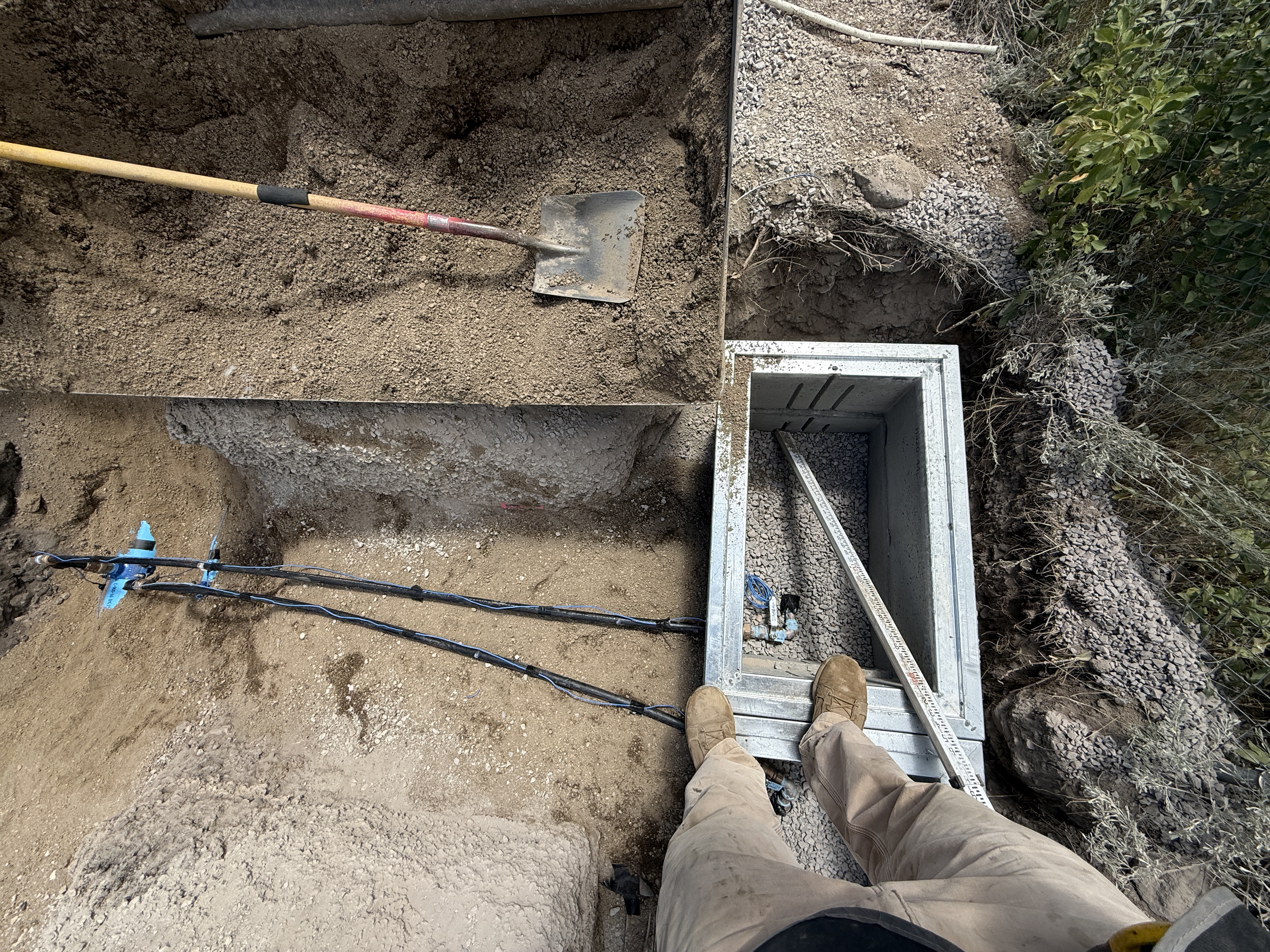 The image captures a worker standing on the edge of an open concrete vault, next to an adjacent trench. There is a shovel on the ground, and utility lines are visible running through the trench. Gravel surrounds the vault interior, and soil is piled around the trench. Dense vegetation borders the work area.