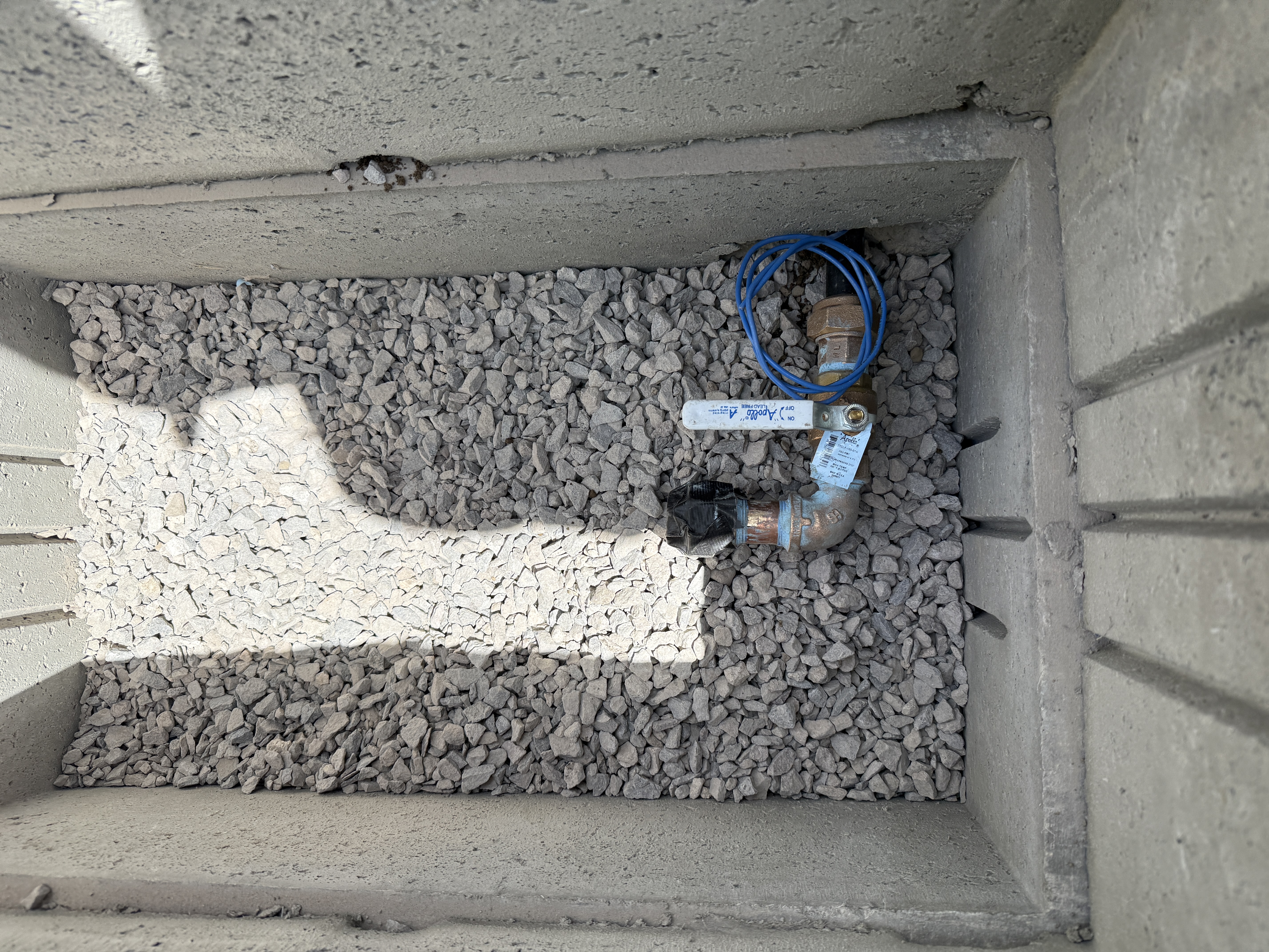 The image shows a valve assembly within a concrete vault, surrounded by gravel. The valve has a labeled handle, and there is a blue coiled cable nearby. The setup suggests components related to a pipeline or utility system. Shadows cast on the gravel indicate outdoor lighting conditions.