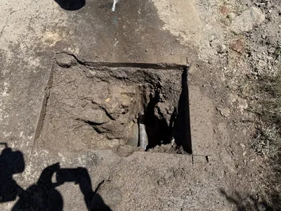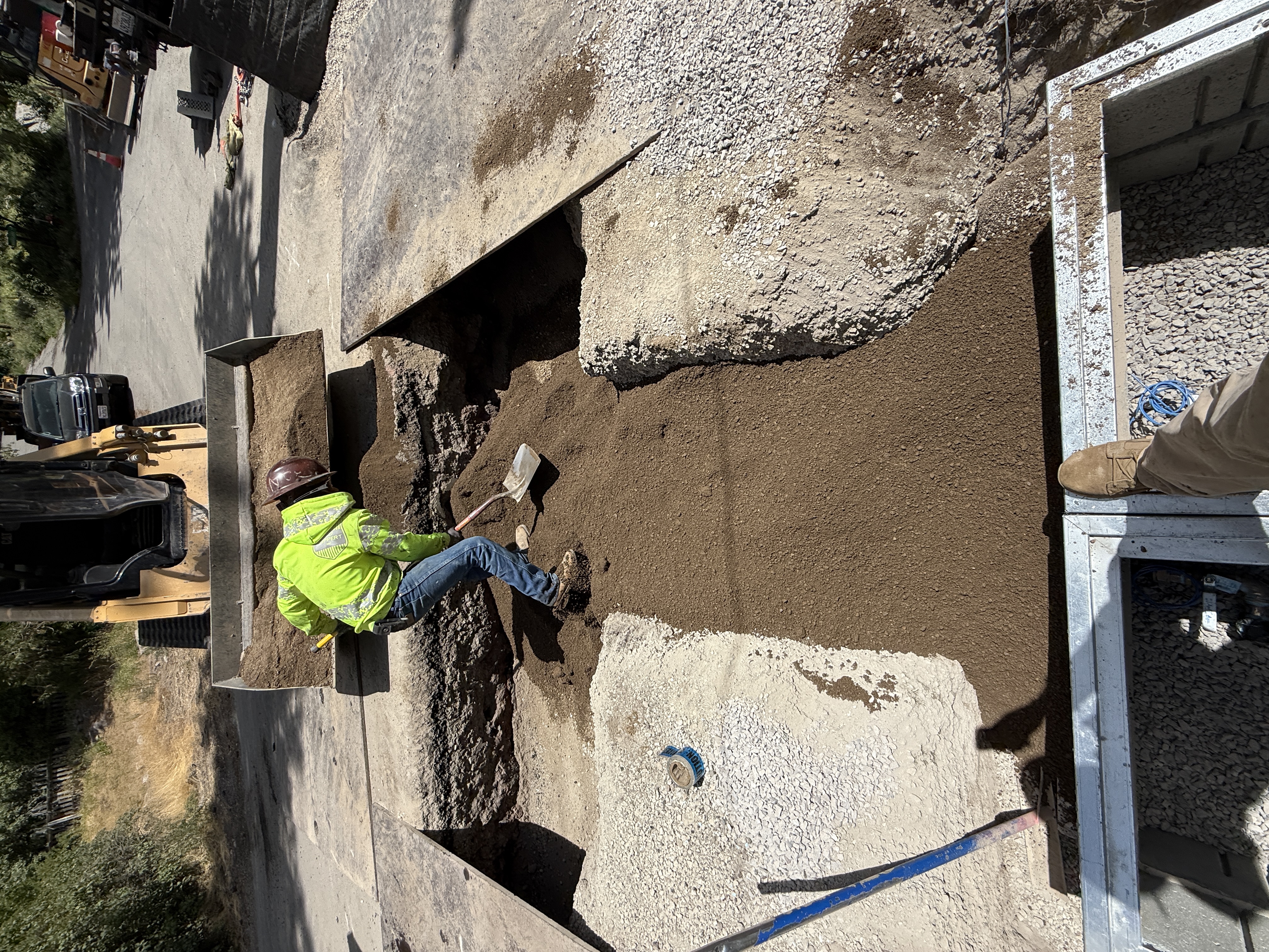 A worker wearing hi-vis gear and a hard hat uses a shovel to distribute soil into a trench. A front-loader is nearby with its bucket positioned towards the trench, appearing to supply the earth material. The trench is partially filled with soil and gravel, with metal plates presumably to stabilize the area. This is part of an active backfill process.