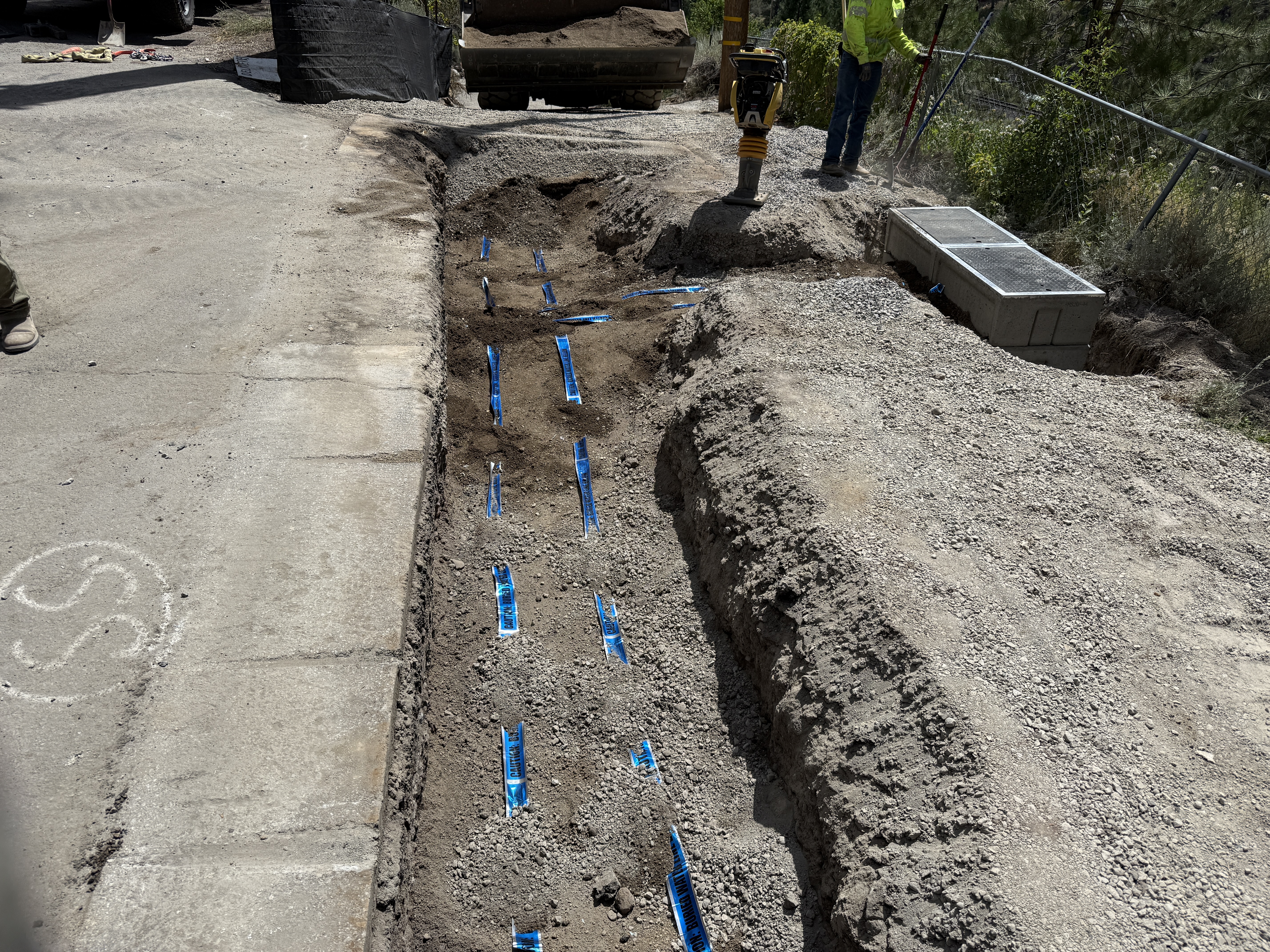 The image shows an open trench parallel to a paved surface with blue-marked pipes laid in it. A worker is standing next to a trench tamper, compacting the soil around the trench. A rectangular concrete vault is present at the far end of the trench. The trench is adjacent to fencing and vegetation.