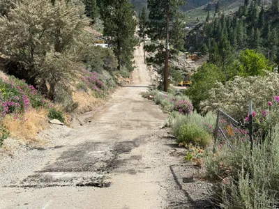 The image shows an excavator positioned near an open trench in a paved road. A plate compactor is visible at the trench's edge, and safety cones are placed around the area. The surrounding environment includes trees and a fence, suggesting work in a residential or wooded area. The trench appears to be covered partly by a metal or wooden plate, indicating active or recent excavation activities.