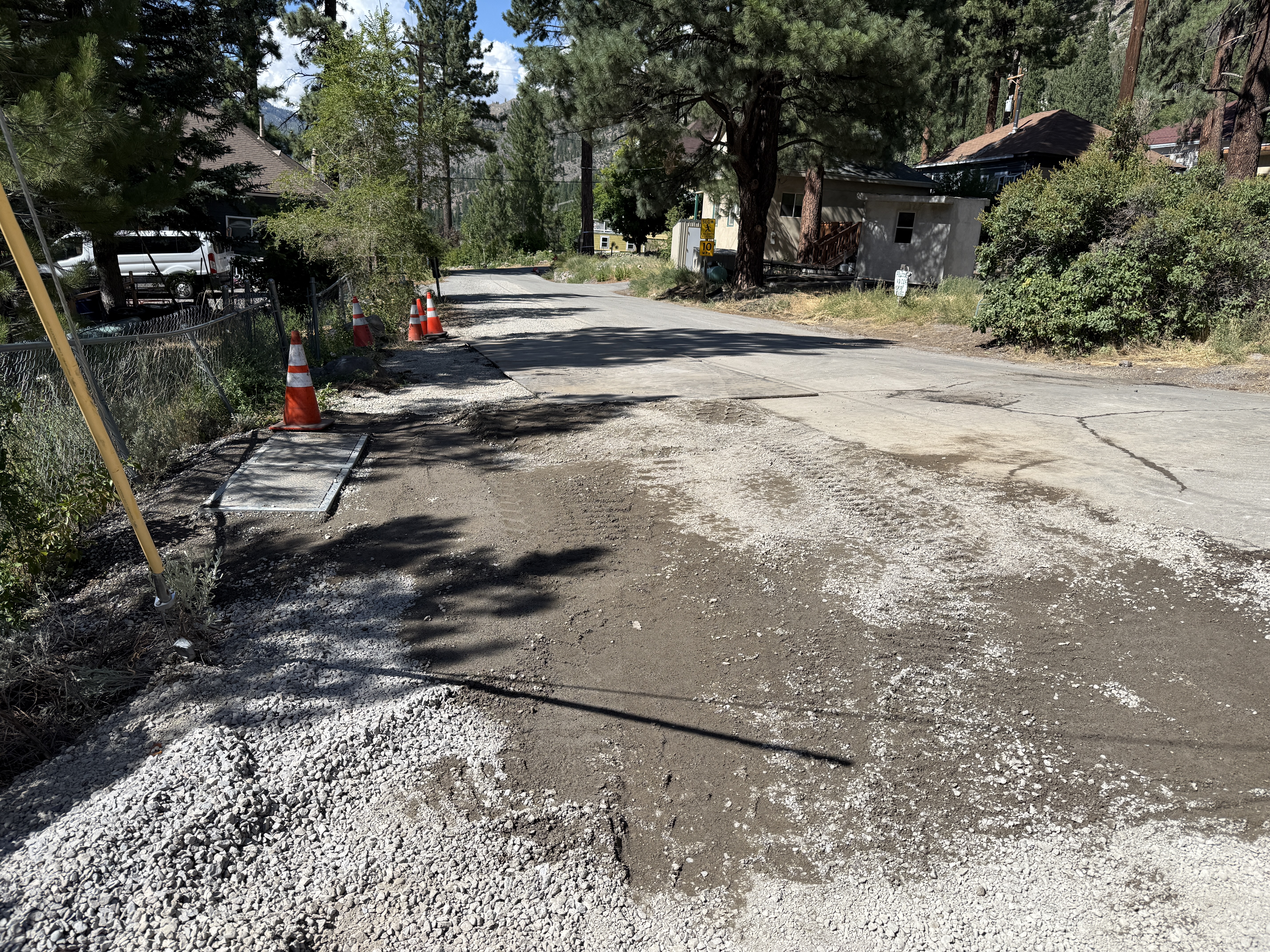 gravel and dirt over existing pavement sunny with clear shadows accessible roadside area