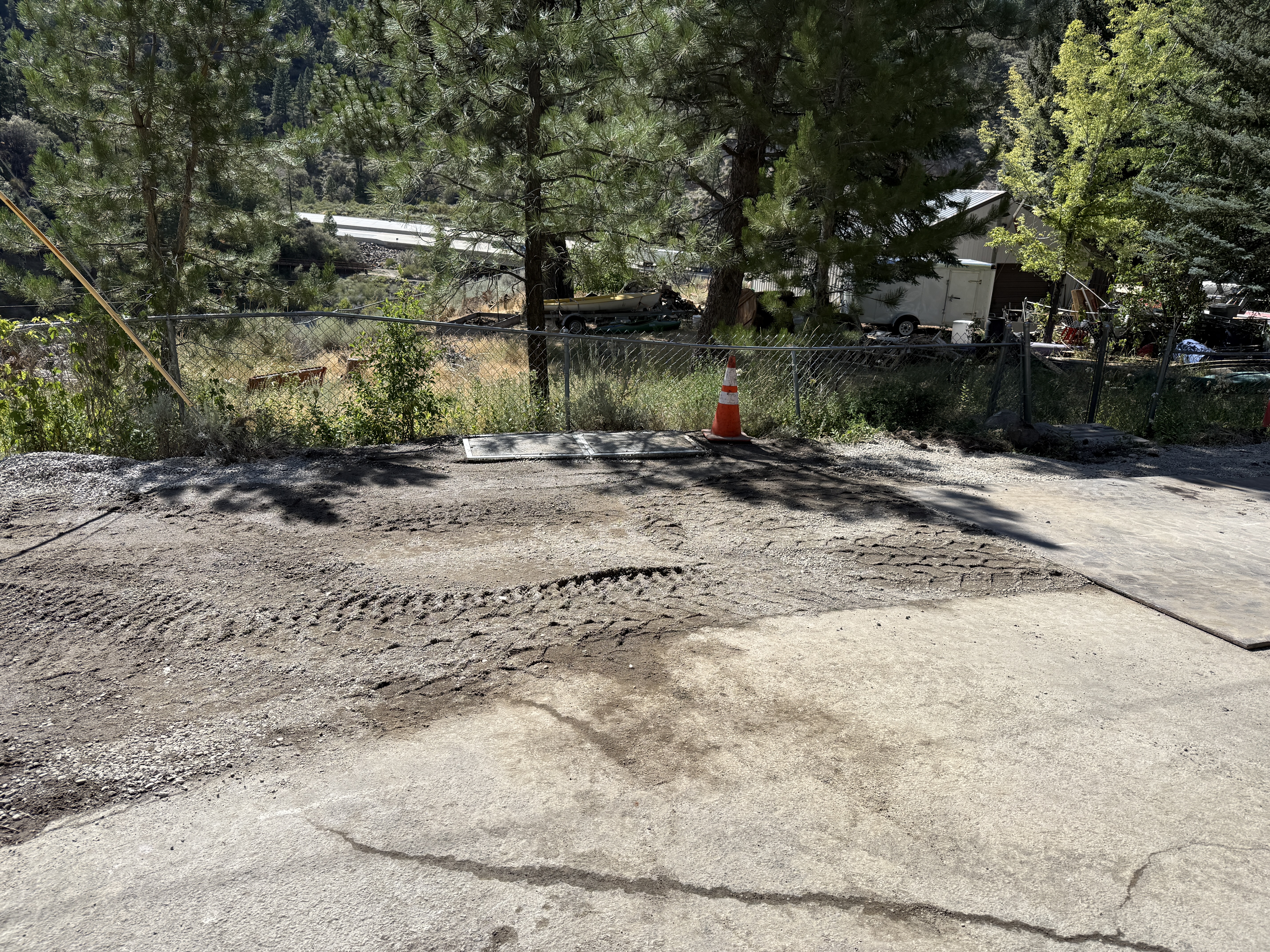 The image shows a partly disturbed area with visible tire marks on the soil, indicating recent grading activity. A traffic cone is placed near a fence, suggesting safety awareness. Trees and some structures are visible in the background. The area appears to be a transition between soil and pavement, with no active construction work visible.