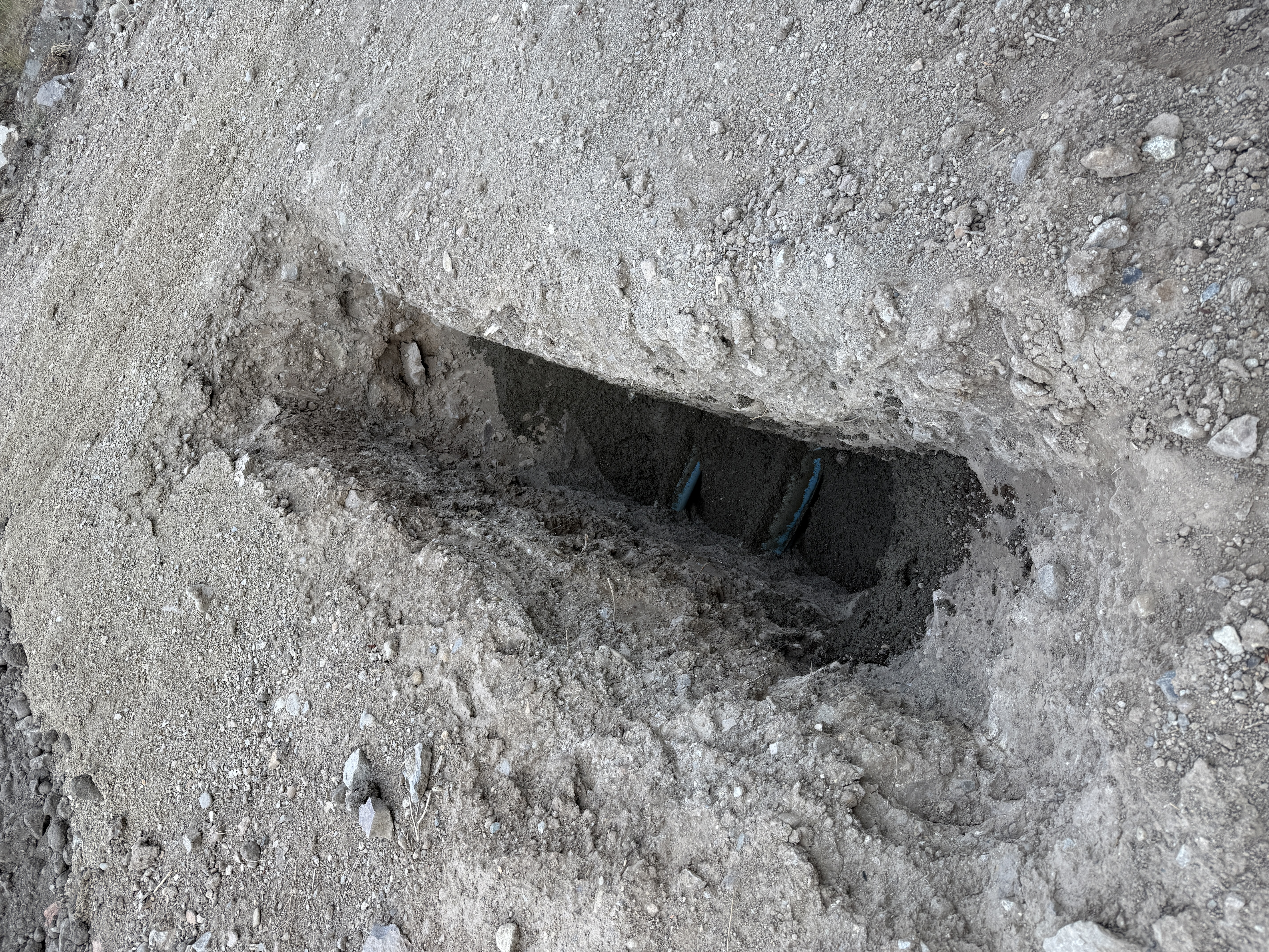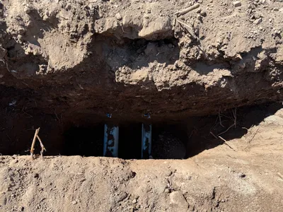 A trench is dug into the ground, exposing earth and soil, with visible utility pipes at the bottom. The trench is relatively deep and narrow, indicative of utility work. There is no visible shoring or safety equipment present in the trench.