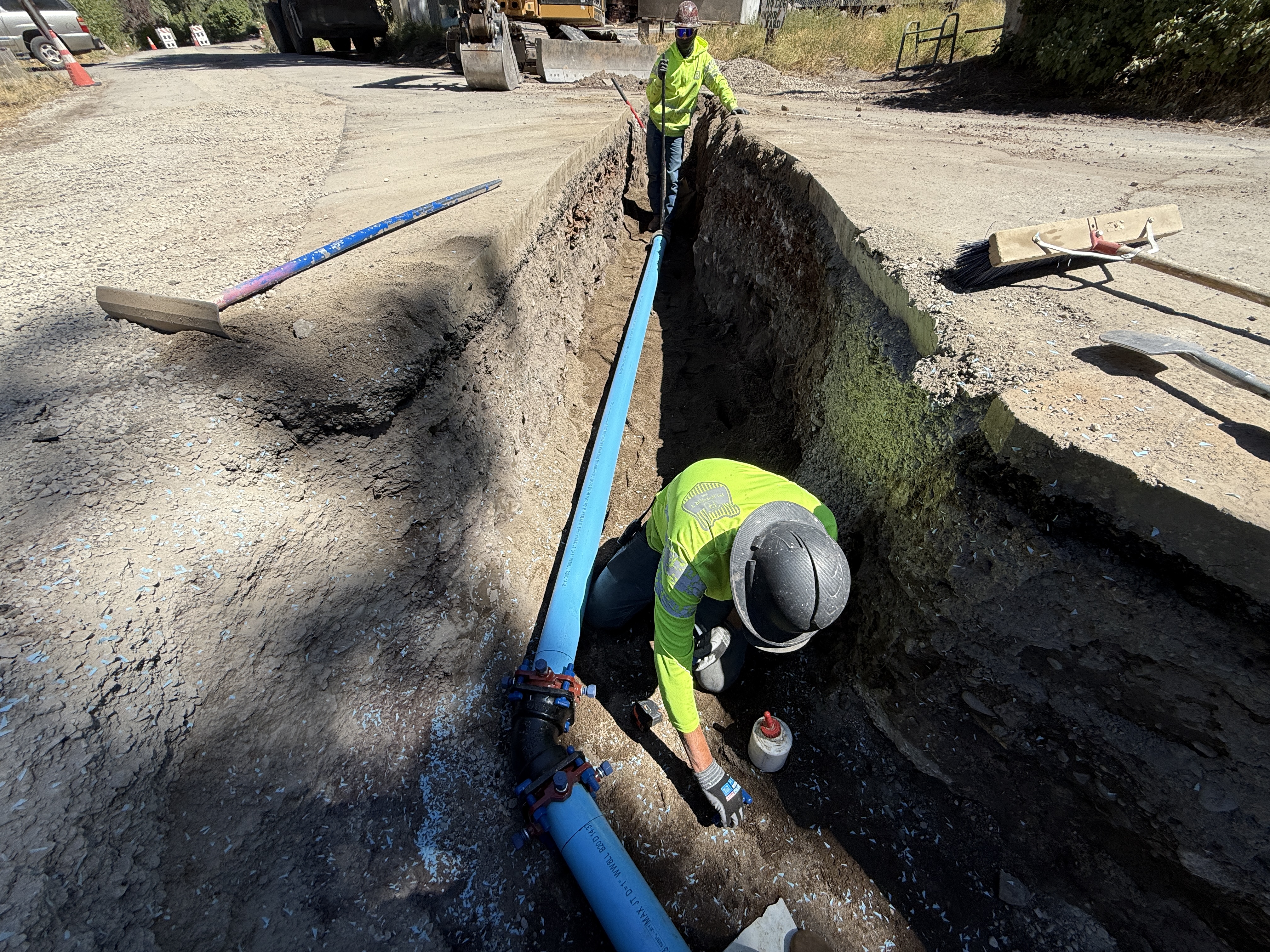 Two workers are installing blue pipes in a trench. One worker is positioned in the trench applying material to a pipe connection, while the other stands nearby. Various hand tools, such as shovels and brooms, are present near the trench edge. The surrounding area is paved, showing signs of excavation, and a vehicle can be seen in the background.