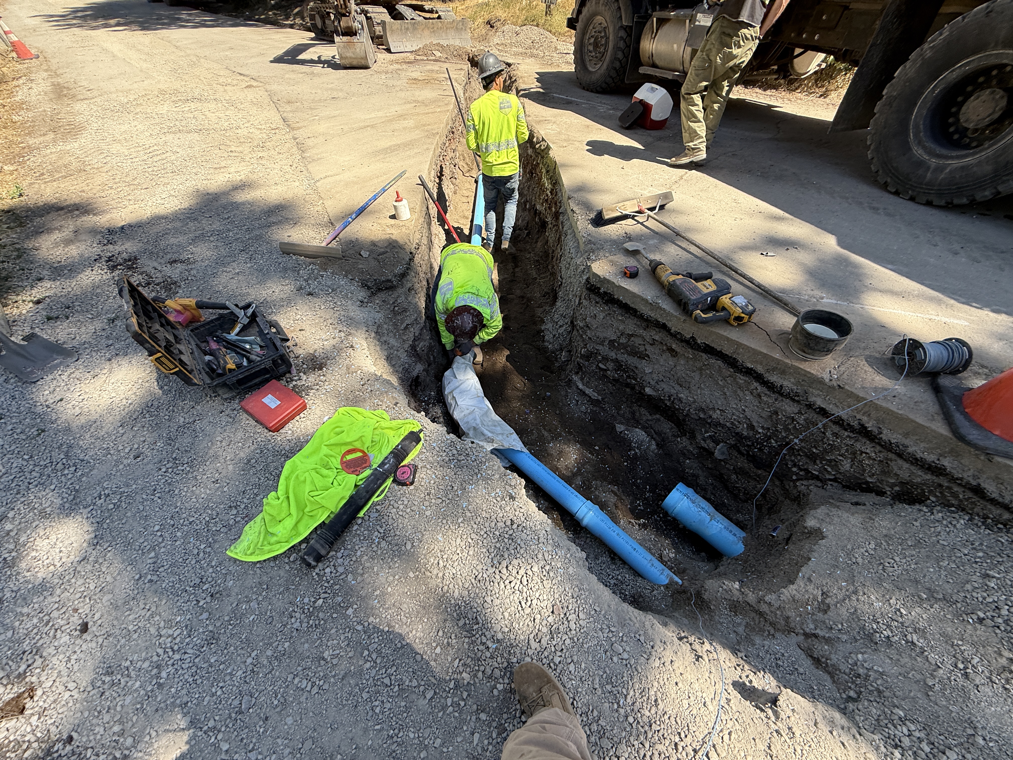 The image shows a trenching activity where two workers in hi-vis vests are preparing or installing blue pipes. Tools and a toolbox are positioned nearby along the trench edge, and a large truck is parked adjacent. There are several safety cones and equipment laid out along the trench area. The ground surface is a mix of gravel and dirt.