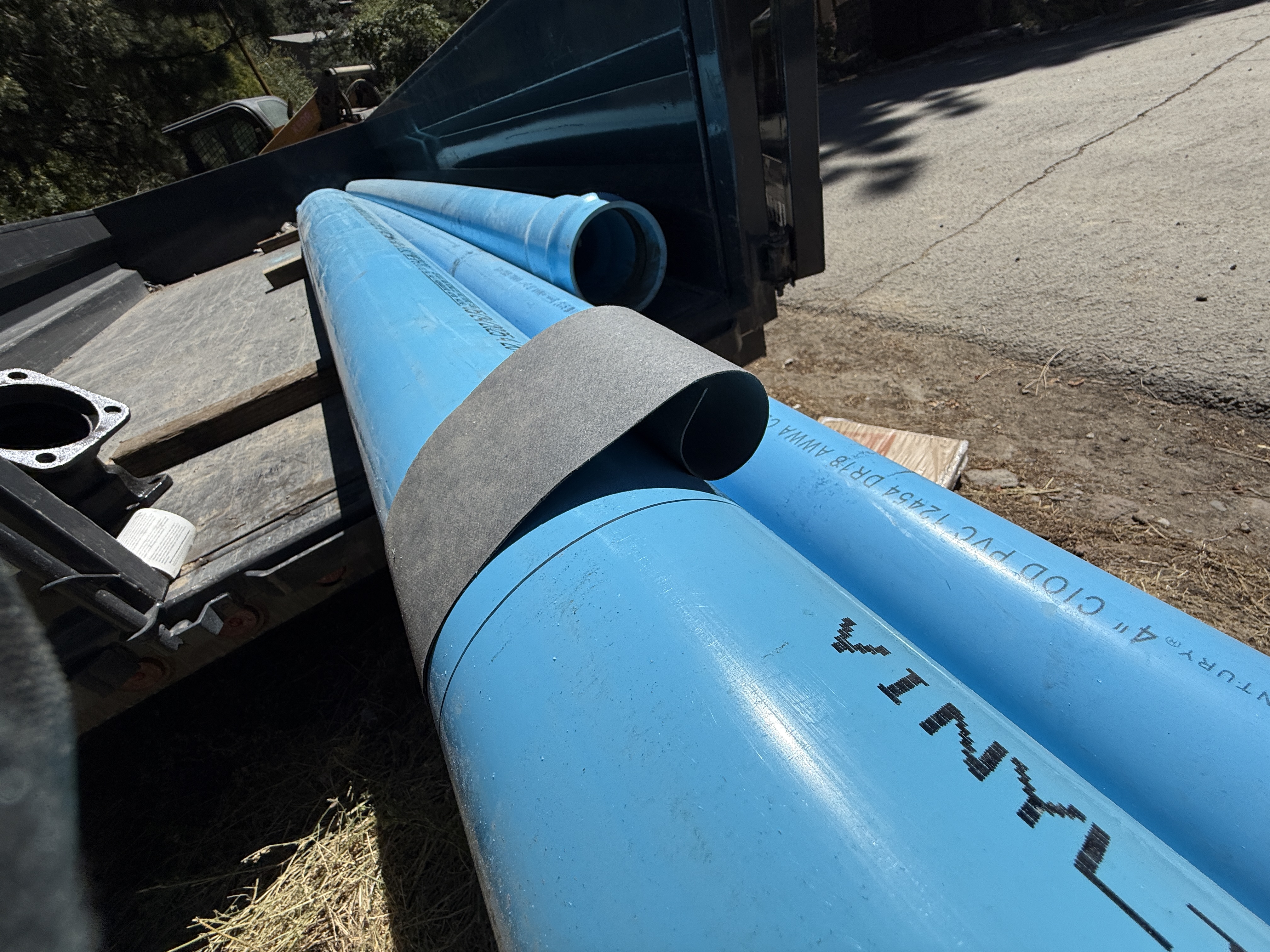 The image shows blue PVC pipes secured in the back of a truck. There is a securing strap wrapped around the pipes, keeping them in place. The truck is positioned on a paved surface adjacent to some soil and grass. Nearby construction equipment is partially visible in the background. The context suggests the site is prepared for pipeline installation, but activity is not currently observed.