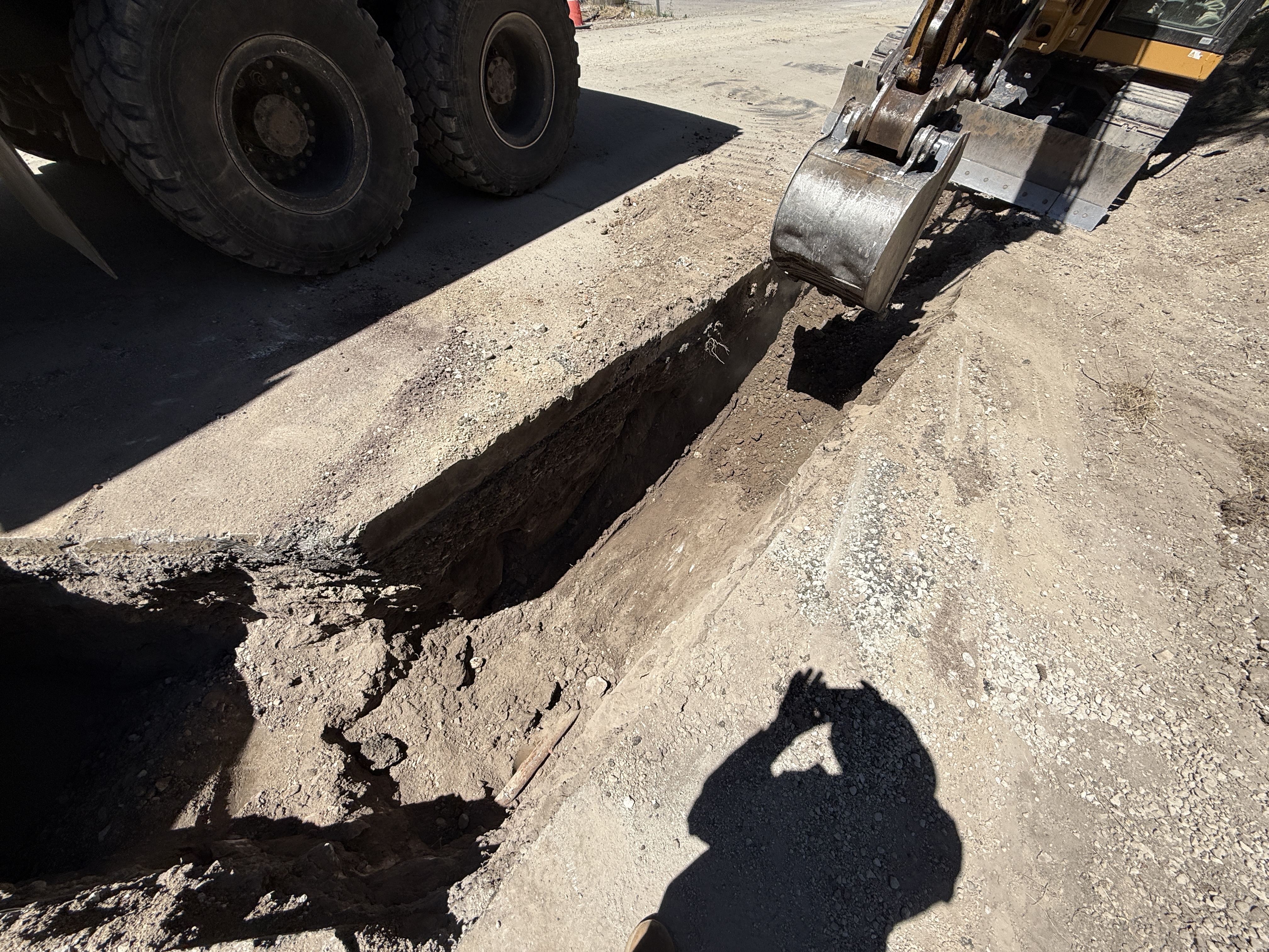 dirt surface with open trench sunny with strong shadows appears open with large equipment access