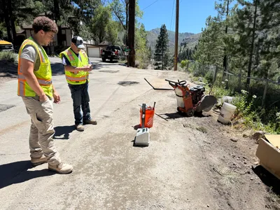 The image shows a trench being dug on a construction site, with two workers wearing protective gear. Traffic cones are placed around the trench, and the surface is a mix of gravel and dirt. A worker is operating a saw on the pavement edge near the trench. The trench appears to be part of utility work, with blue markers indicating possible utility lines.