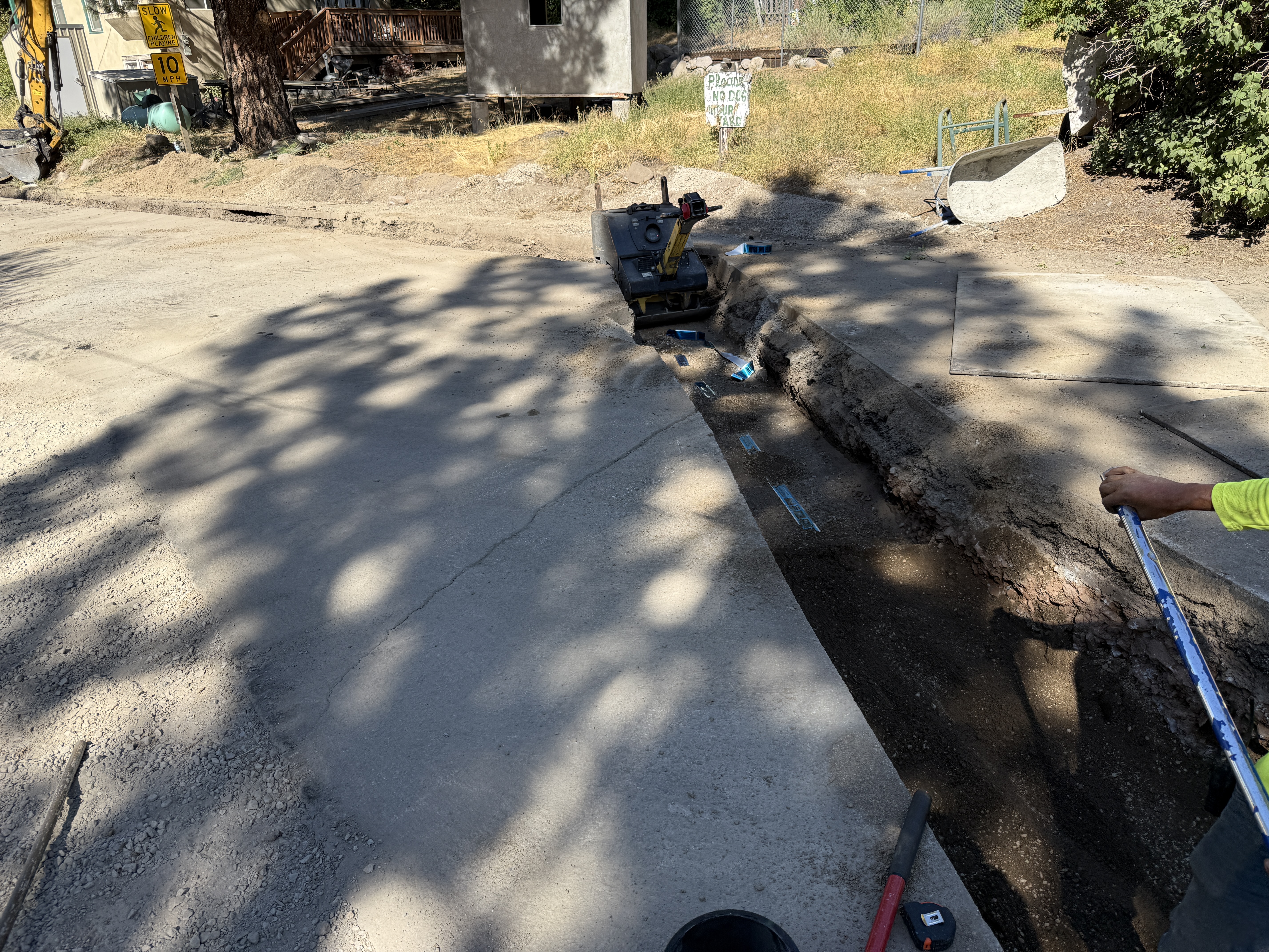 A trench has been excavated along a paved area, with a plate compactor placed inside. A person is holding a hand tool, suggesting active engagement in trenching. Blue markers are visible along the trench, possibly indicating alignment or measurement. Surrounding vegetation and signage frame the work area.
