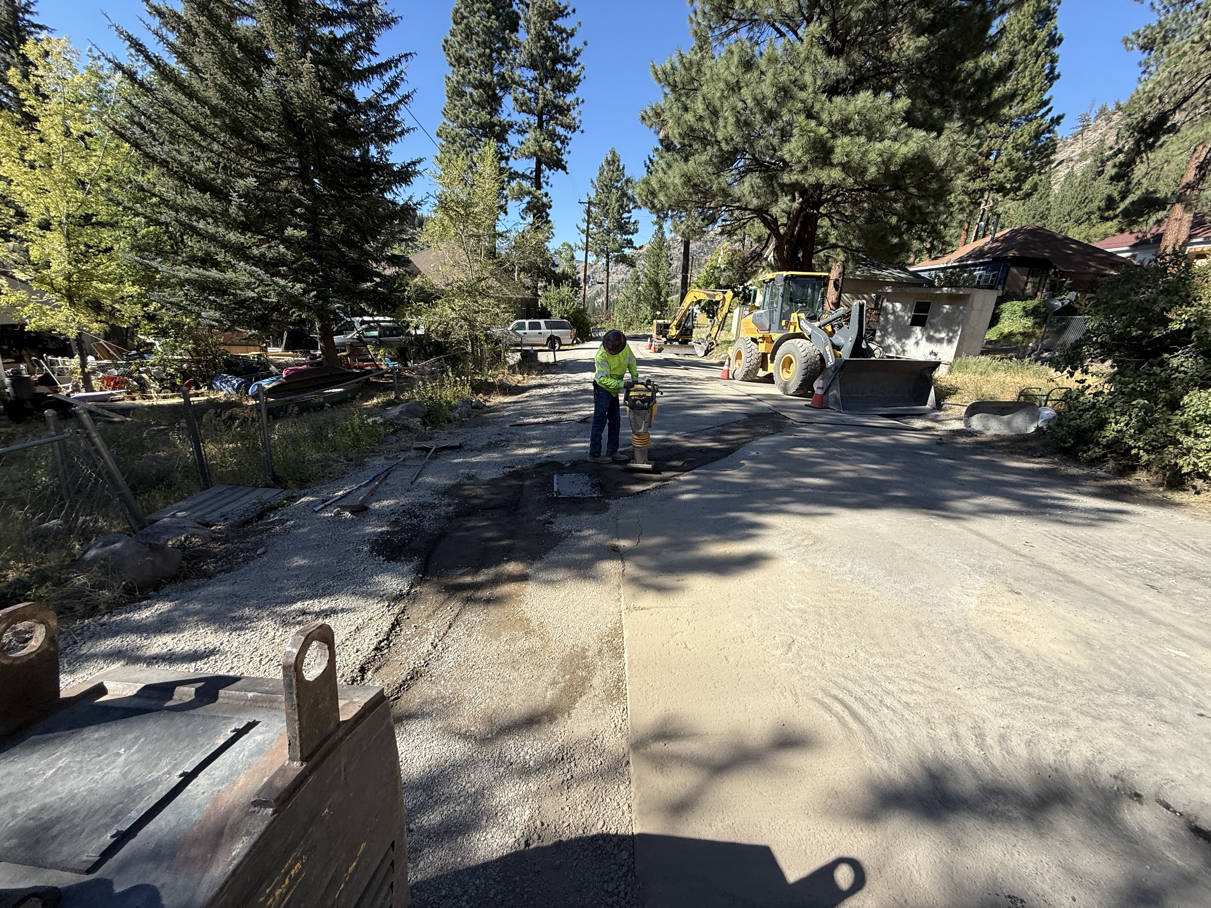 In the center of the image, a worker is operating a vibratory plate compactor on a section of partially paved road. A loader backhoe is positioned to the right, indicating ongoing repairs or surface preparation. Additional construction tools are placed along the road edge. The setting is amidst a forested residential area, indicating possible road maintenance or restoration work.