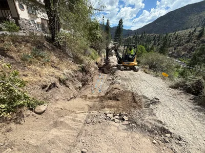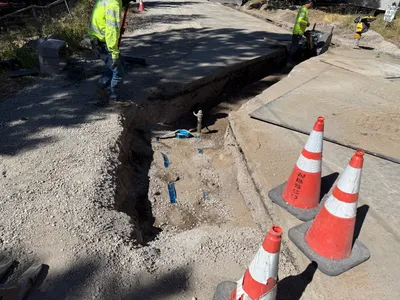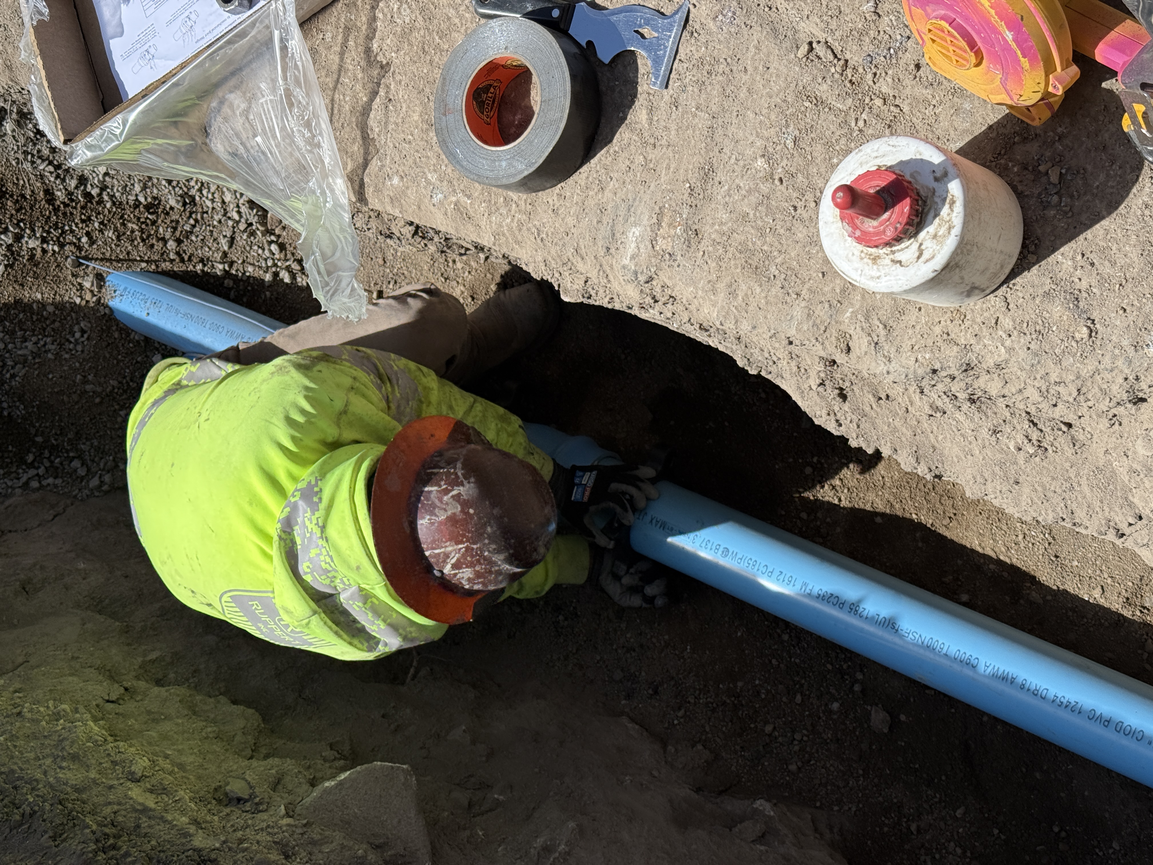 The image shows a worker in a trench installing a blue pipe. The worker is wearing high-visibility clothing and working near a container of adhesive and a roll of duct tape. The trench is dug into soil, with loose earth visible around the worker. The trench appears narrow and deep enough to accommodate the pipework.