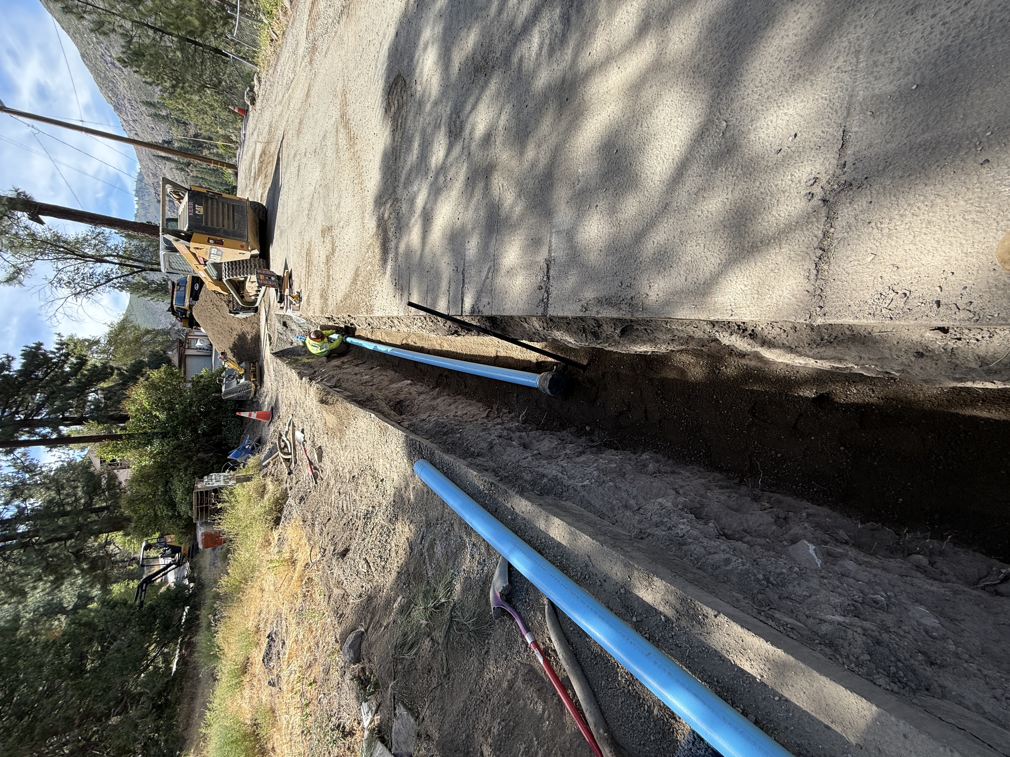The image shows an open trench along a roadside with a blue pipe being installed. A worker is seen inside the trench handling the pipe. A skid steer loader and an excavator are visible nearby, suggesting active excavation and pipeline work. Several construction cones and tools are present around the work area.