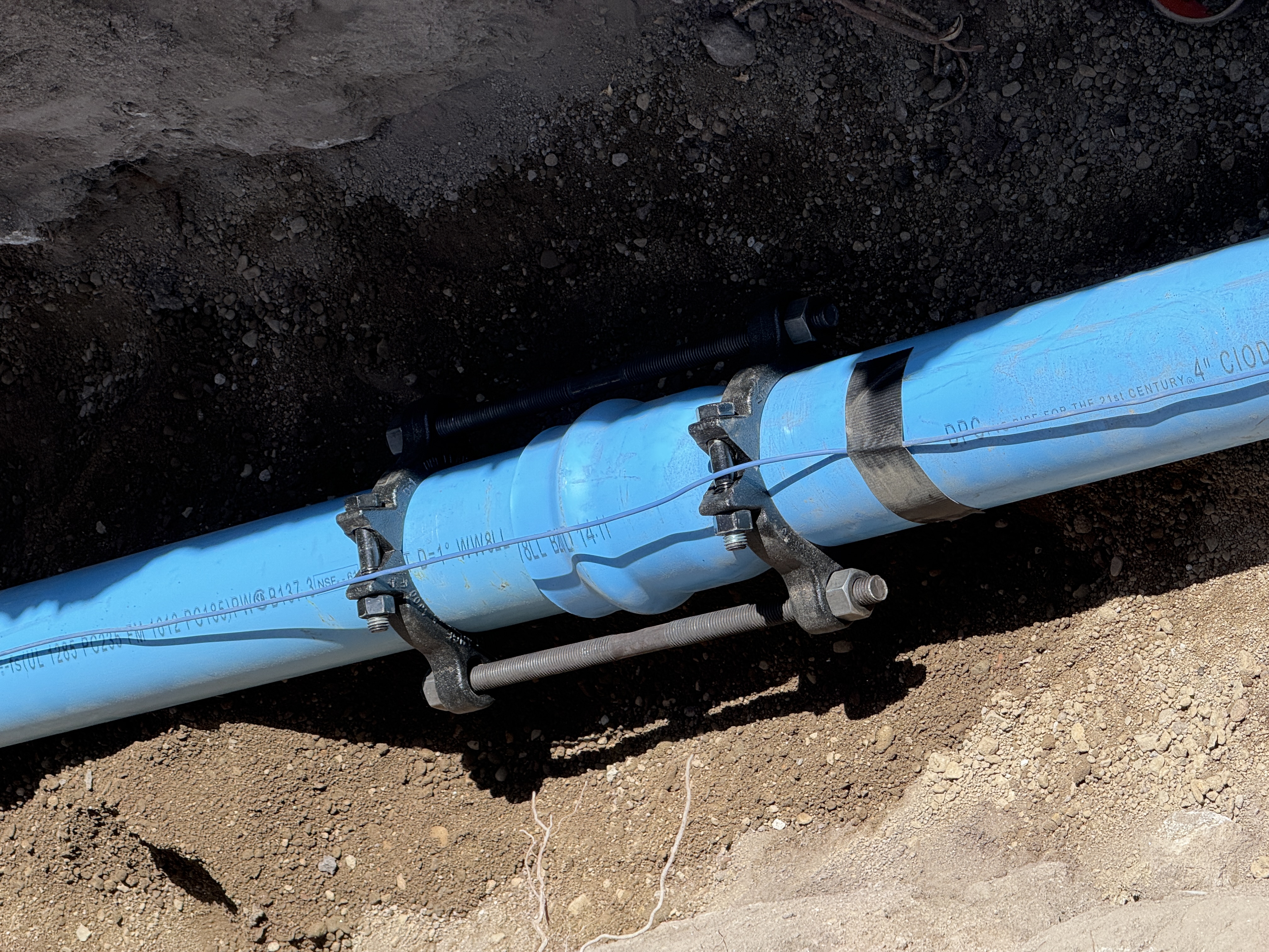 The image shows a section of blue pipeline secured with mechanical joint restraints, indicating pipeline installation in progress. The pipe lies in a trench with visible soil surrounding it. A wire runs along the length of the pipe with tape securing part of it. The trench appears to be partly filled and open on top.
