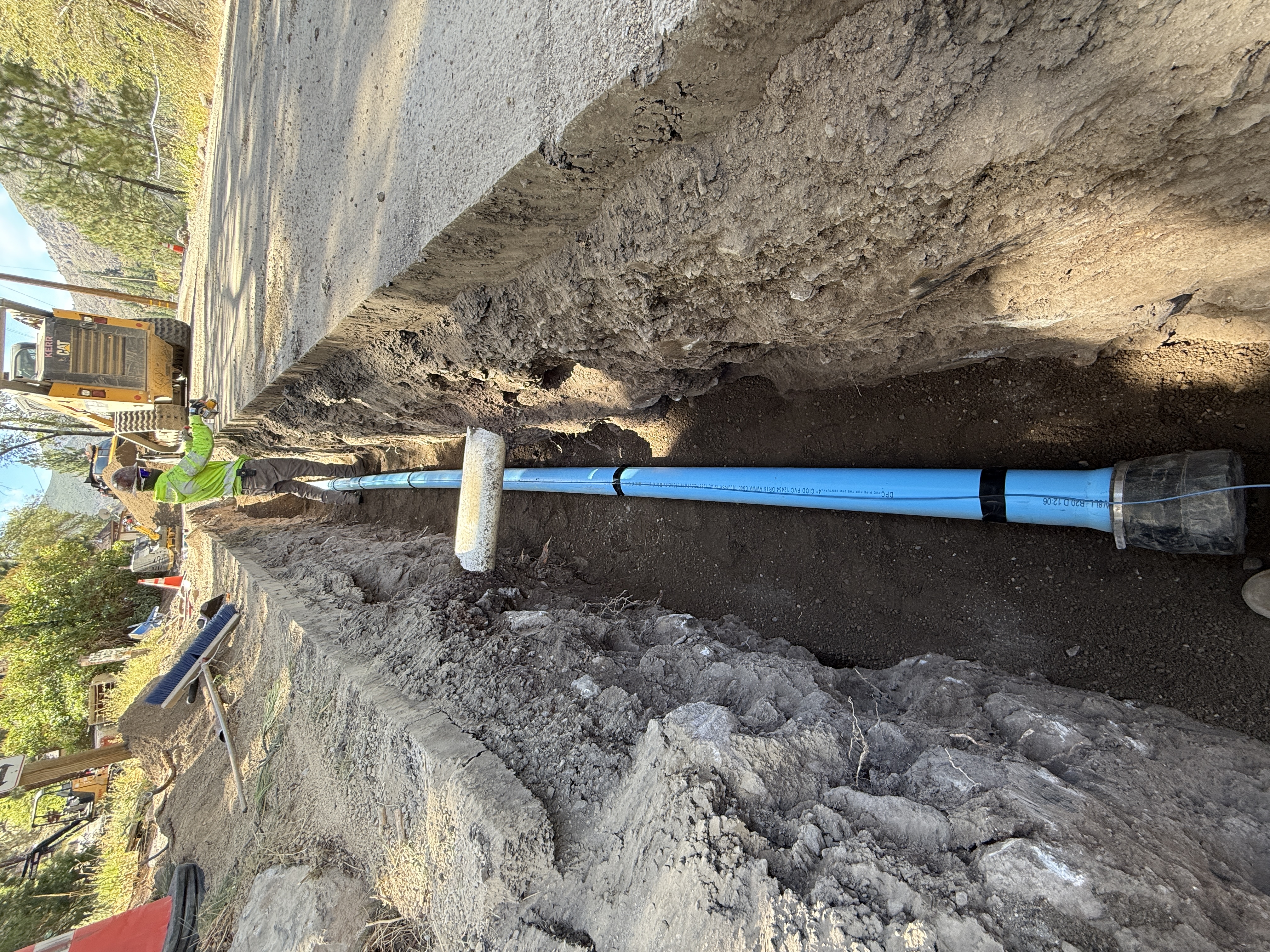 An open trench is visible with a blue pipe being installed along the trench's length. A worker is standing in the trench, possibly involved in aligning or securing the pipe. A yellow excavator is positioned nearby on the edge of the trench. The worker is wearing safety gear, including a hi-vis vest and hard hat. Additional construction materials like dirt are seen on the trench's edge.