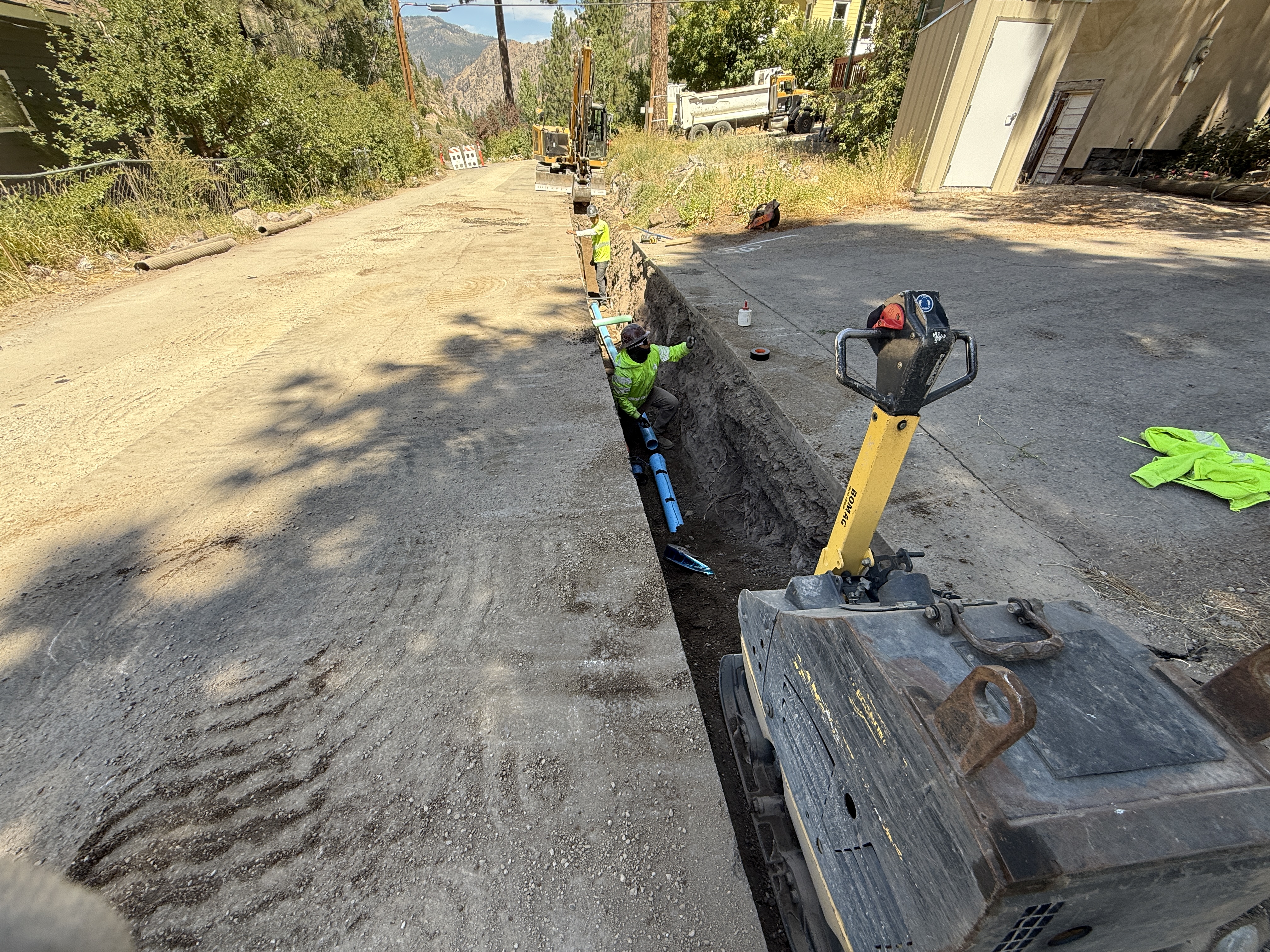 The image shows workers in an open trench installing what appears to be blue pipes. A trench compactor is positioned near the trench edge, and construction workers are actively placing pipes. A dump truck and excavator can be seen in the background, likely used for trenching and material handling.