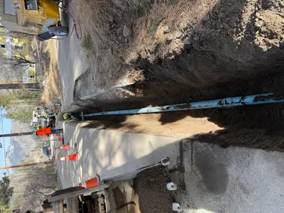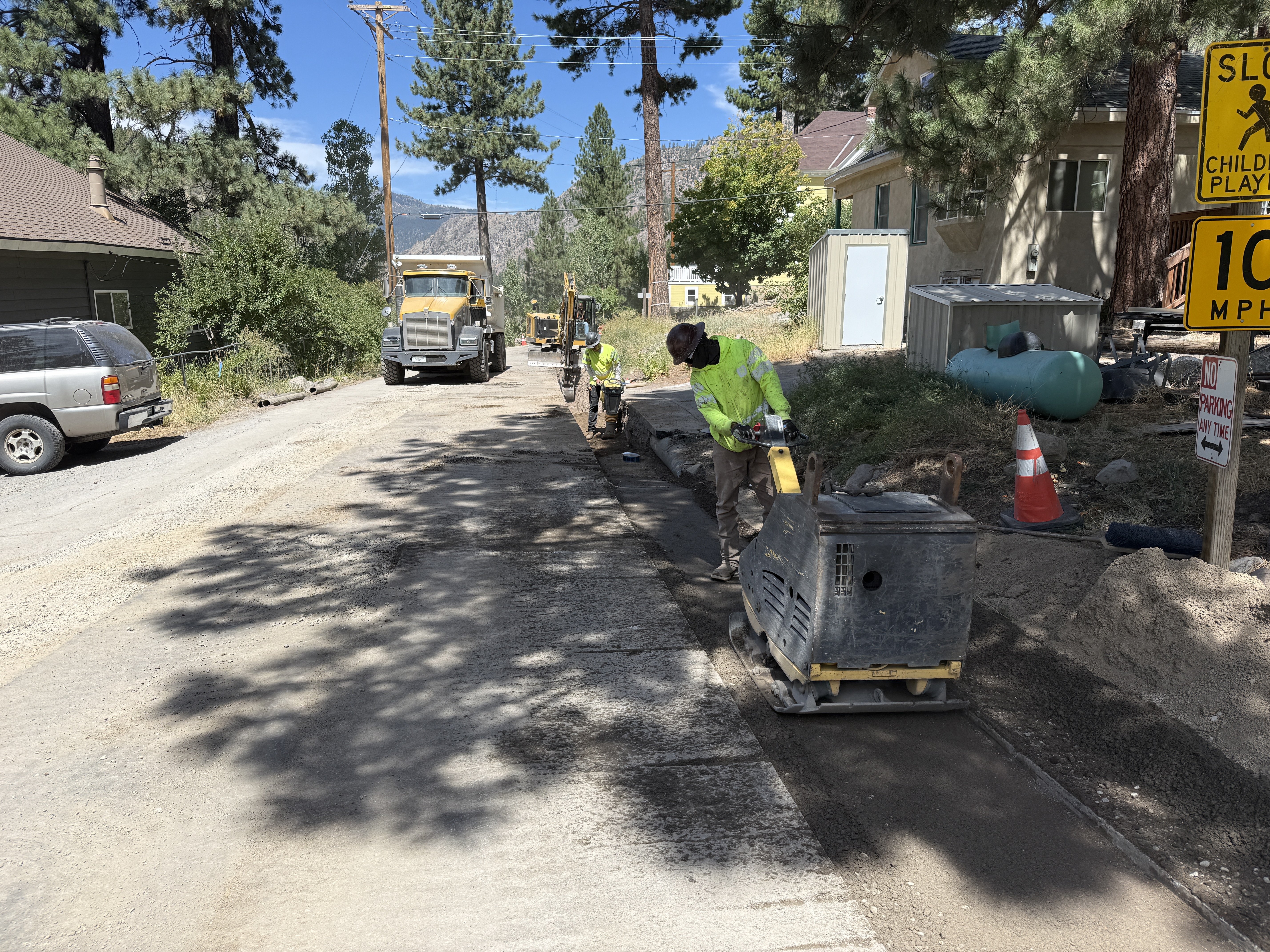 Two workers in high-visibility clothing are operating a compactor on a dirt section of a residential road. A dump truck is parked nearby on the street. Traffic cones and a 'SLOW' sign are visible. The road surface appears uneven where work is occurring.