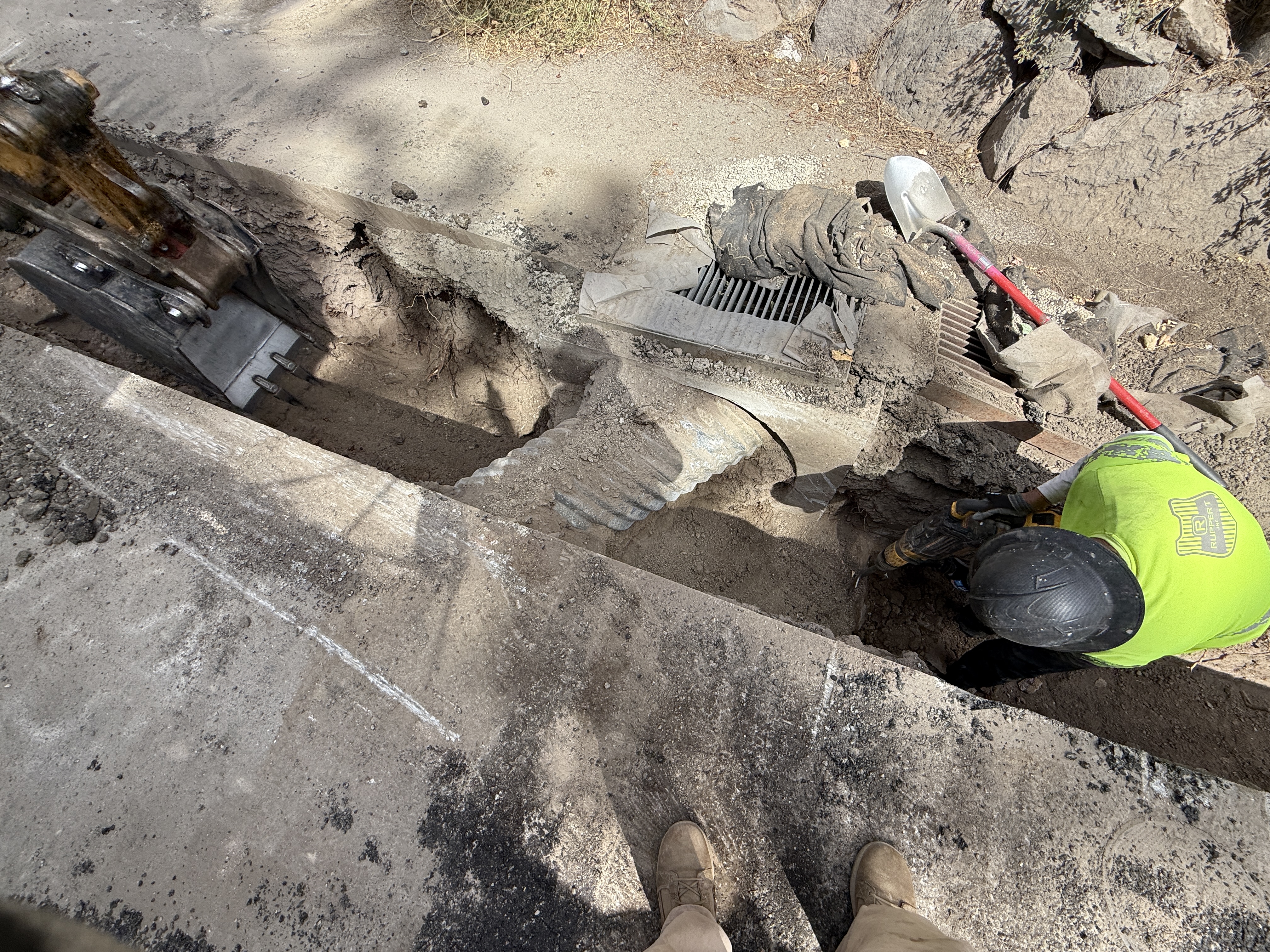 The image shows a worker in a hi-vis vest and hard hat using a hand tool in a trench where a pipe and metal grate are visible. A backhoe bucket is positioned nearby, indicating excavation activity. The surrounding area is composed of dirt and concrete debris.
