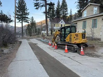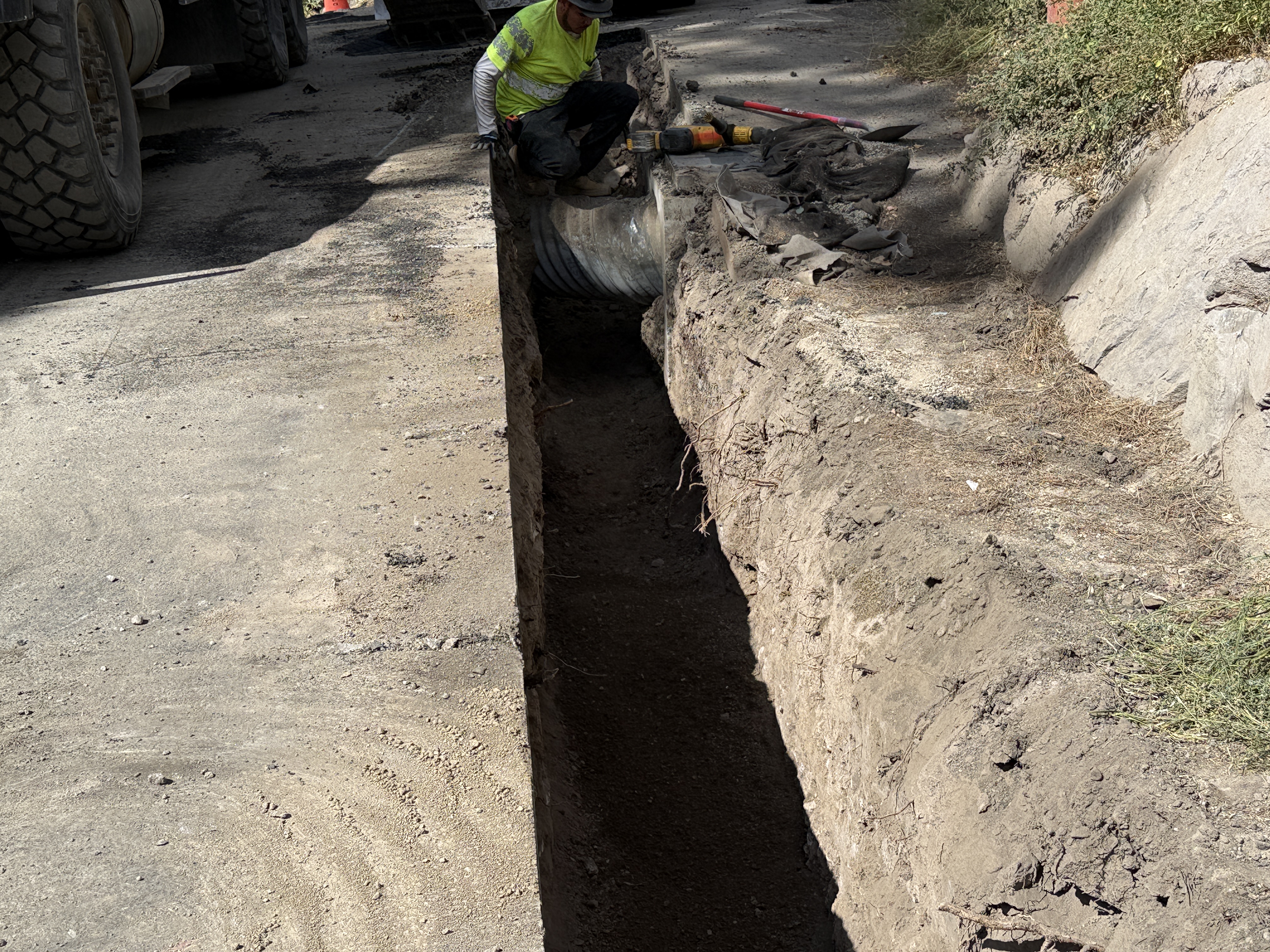The image shows a worker kneeling in a trench, likely involved in trench-related activities. Nearby, hand tools such as a drill and a shovel can be seen. The ground surface is a mix of soil and pavement. The person is wearing PPE, including a hard hat and hi-vis vest.