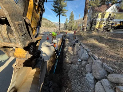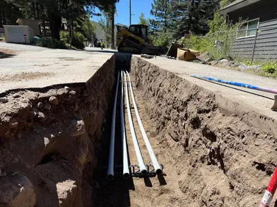 The image shows a trench running along a street, marked by orange construction cones. A large truck is parked nearby, facing the viewer. Construction equipment and workers are visible in the background. The trench appears freshly excavated, but no pipes or specific installations are noticeable. Some tools and materials are scattered near the trench.