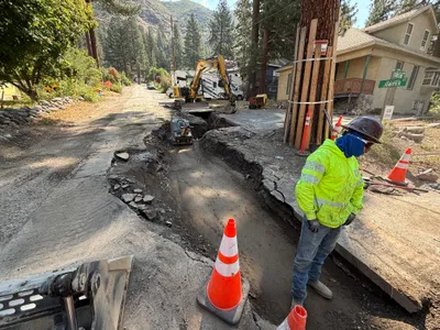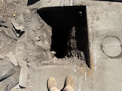 pavement and soil along the trench sunny with clear skies limited access due to trench and parked vehicles