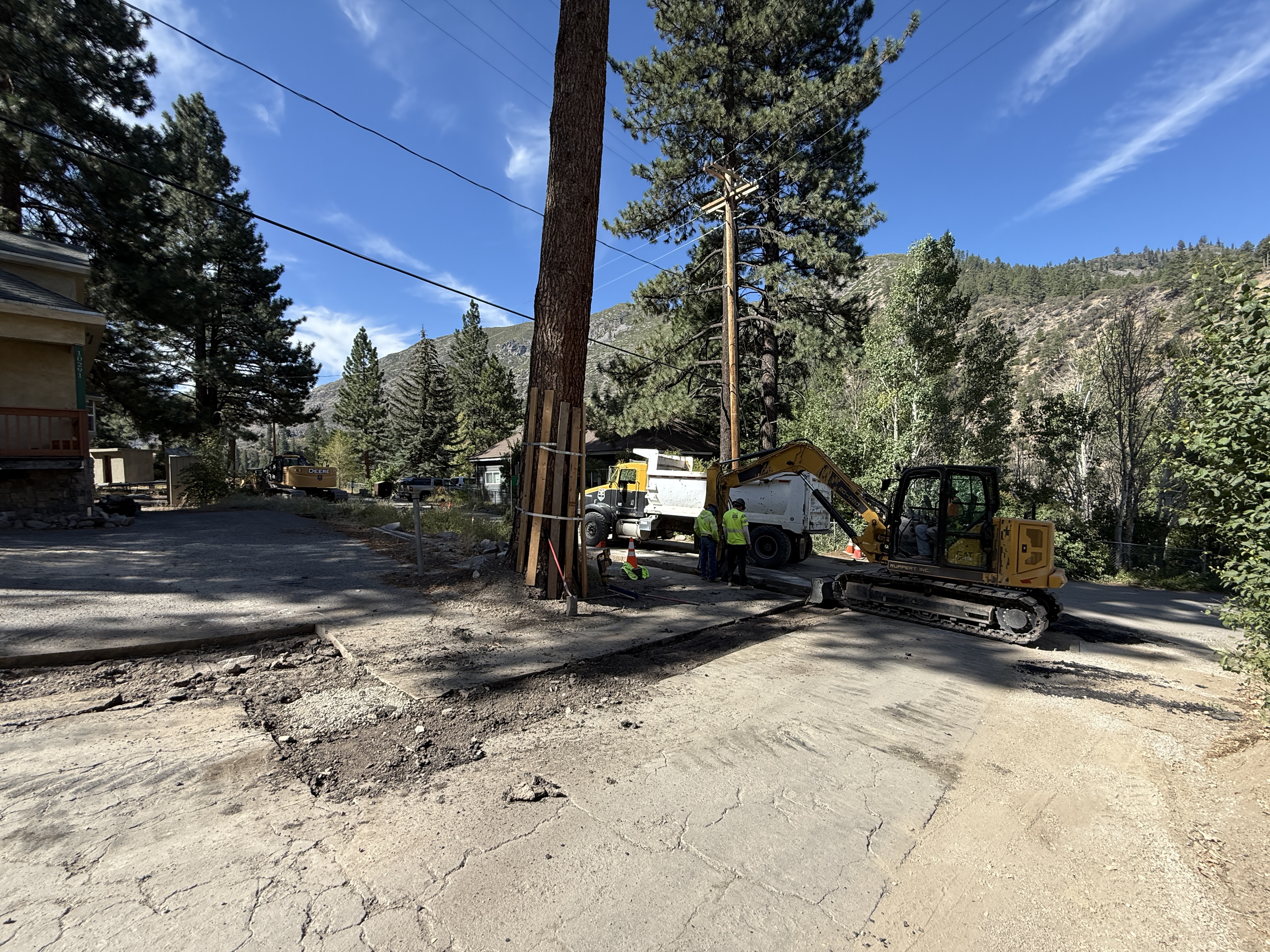 Three workers are present beside an excavator near the center of the image. The excavator appears to be engaged in excavation work, with disturbed pavement and soil visible. Two vehicles are present: a large white utility truck and a yellow excavator. Construction activity seems focused near a utility pole.