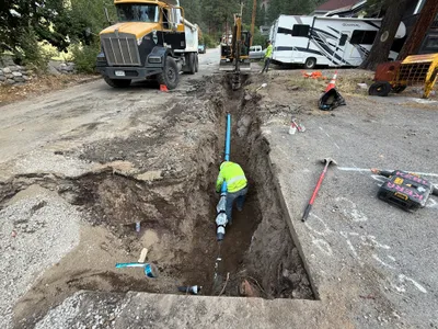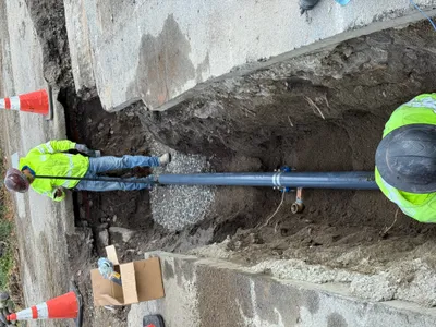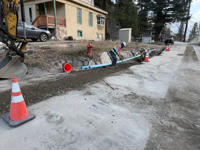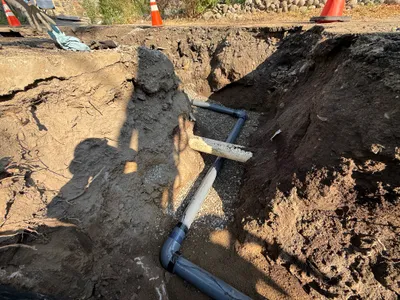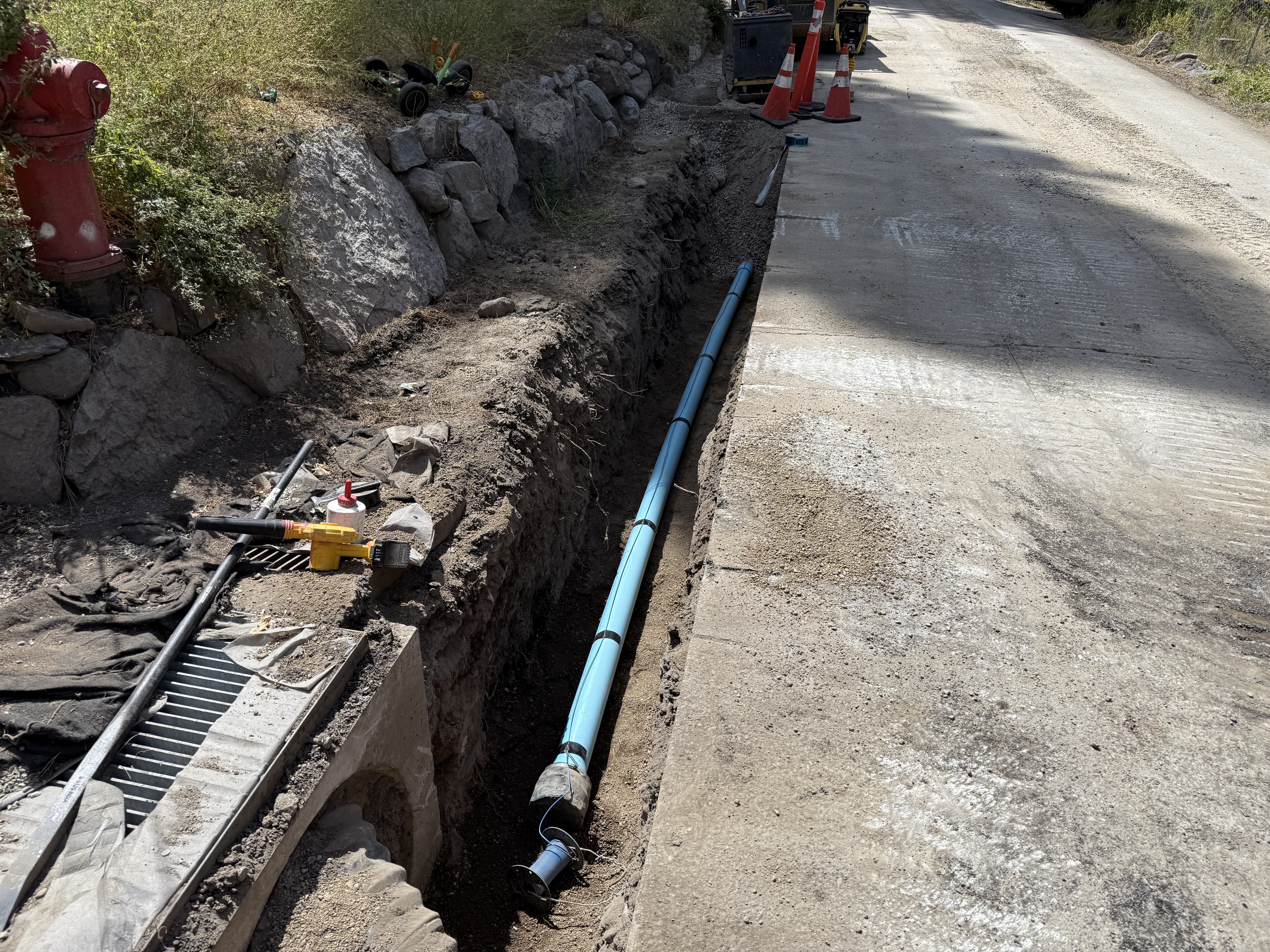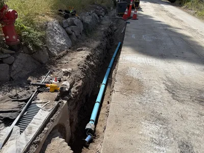 An open trench parallels a road with a blue pipe being laid within it, indicating pipeline installation. Two traffic cones and a fire hydrant are visible near the trench area. Tools and a grate are observed near the trench opening, suggesting ongoing work. The trench runs adjacent to an asphalt or concrete surface.