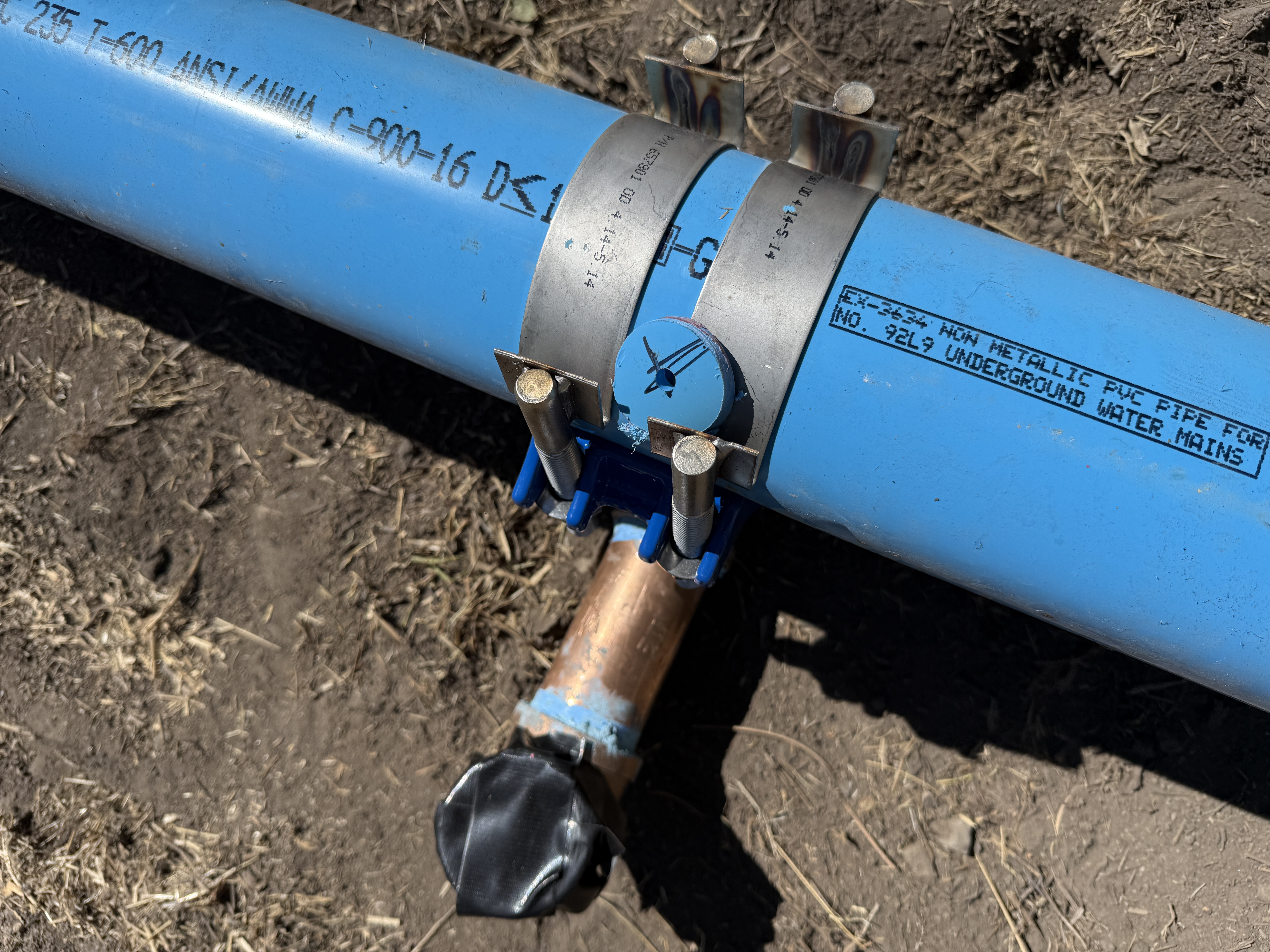 The image depicts a blue PVC pipe connected to a smaller copper pipe. The connection point is secured using a metal service saddle with two sets of bolts and clamps. The larger pipe has visible markings and is partially buried in soil. The surrounding ground appears dry, indicating an outdoor setting.