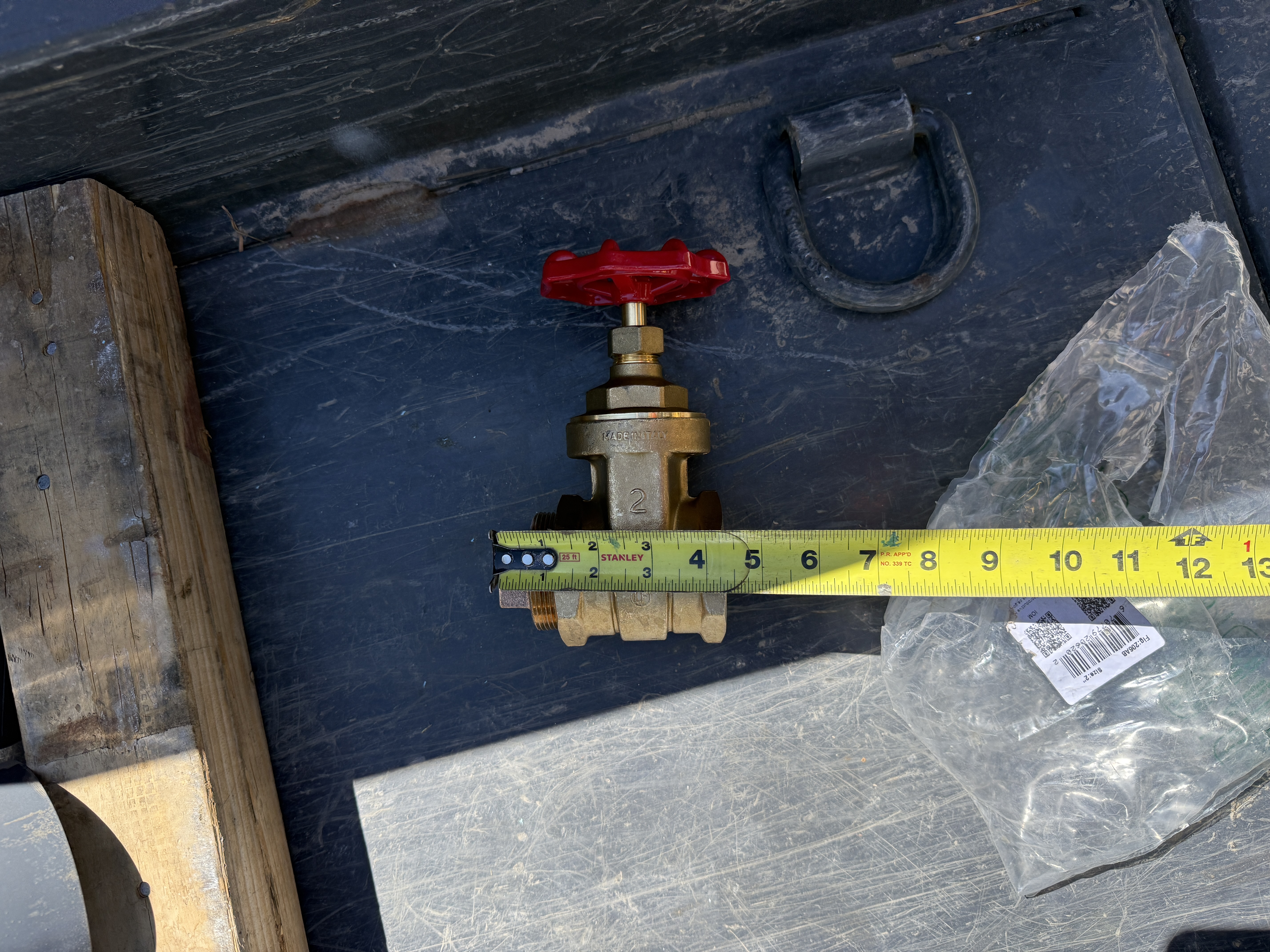 The image shows a measuring tape extended next to a threaded valve with a red handle, positioned on a wooden and metal surface. The valve appears unused and is likely staged for installation. The measuring tape reads approximately 7 inches, indicating the length or size of the valve. There is a plastic wrapper nearby which might have contained the valve initially.