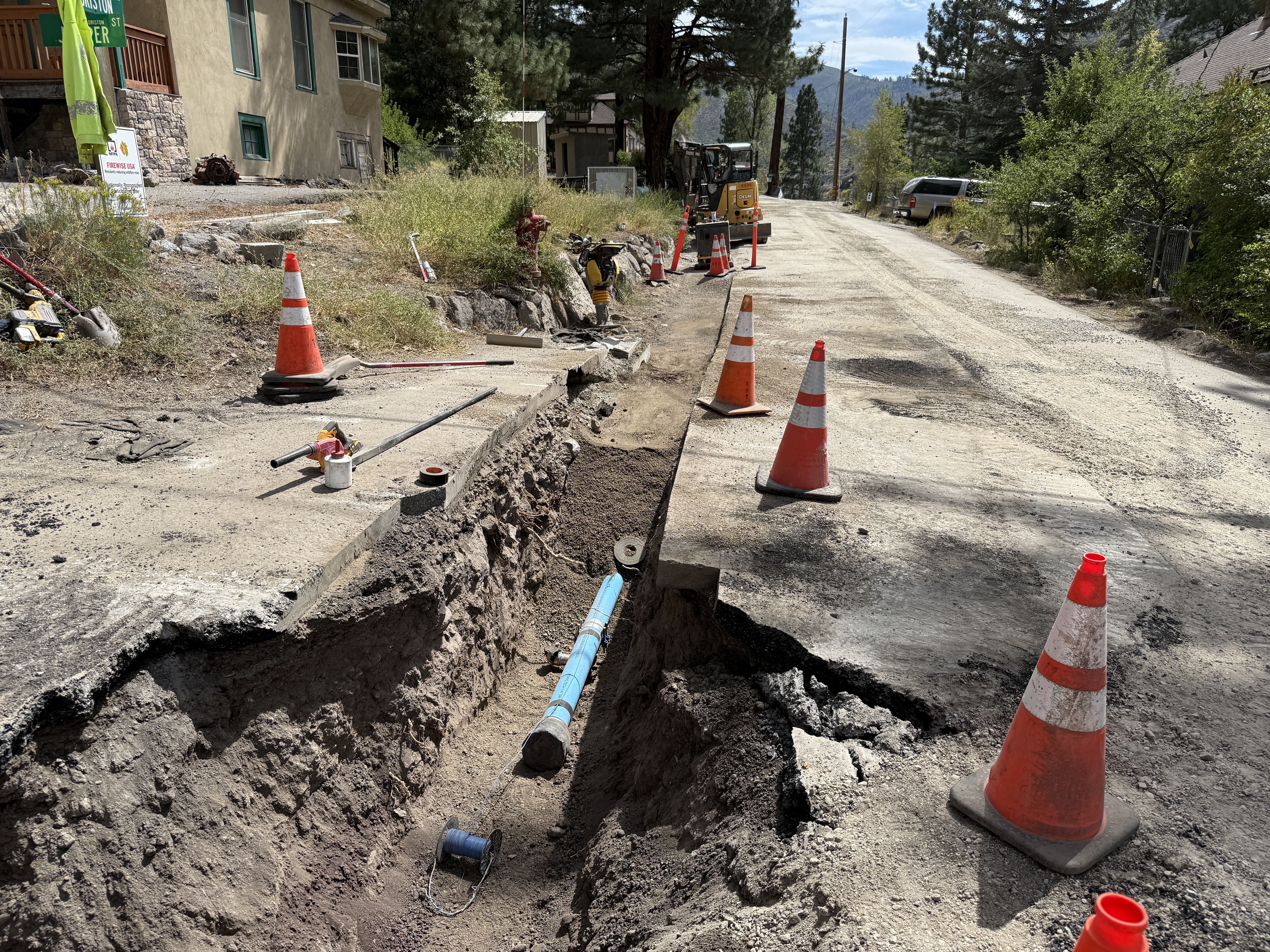 Safety cones are visible marking the trench area, but no PPE is visible in frame.