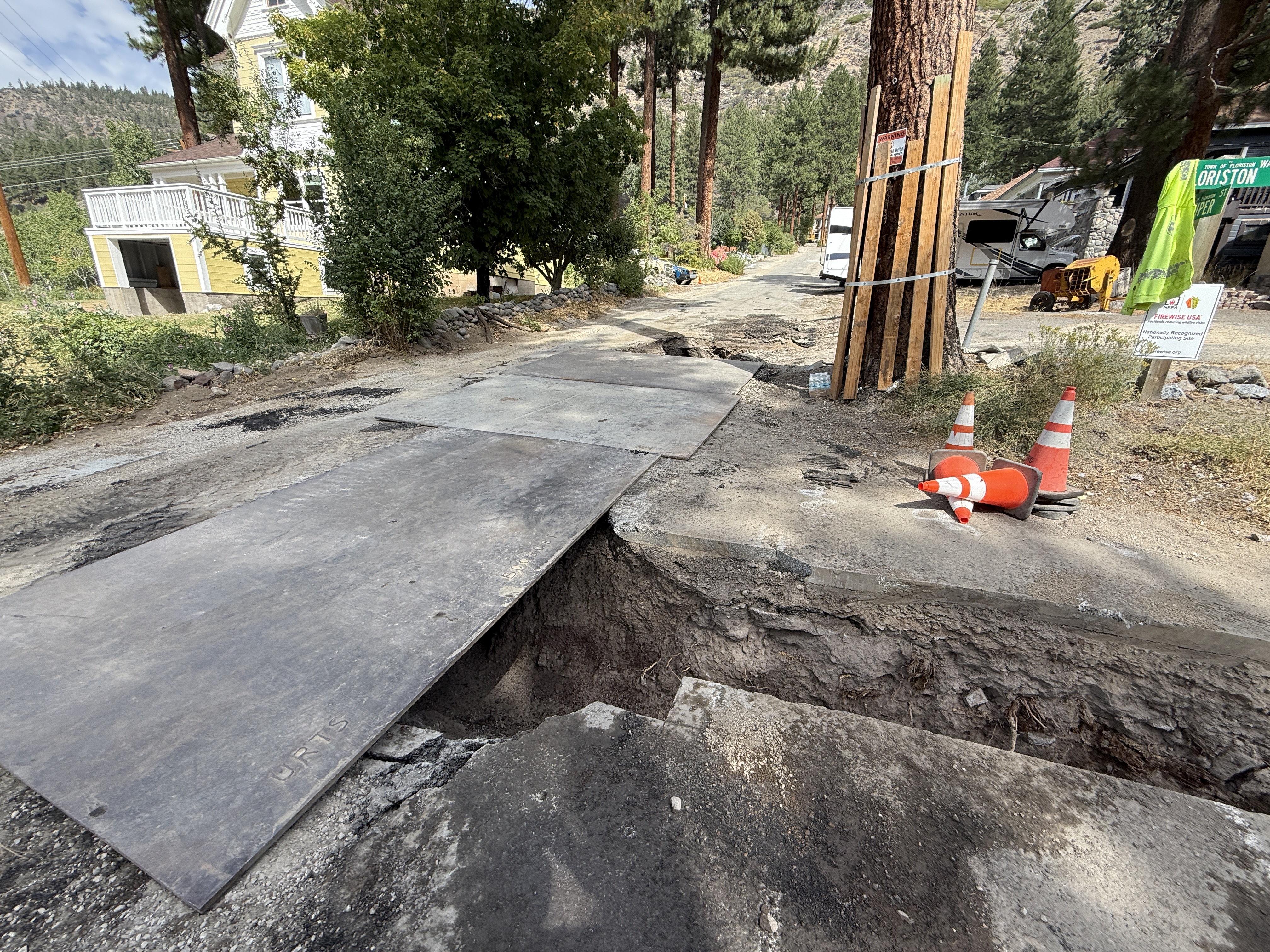 The image shows an open trench on a dirt road with steel plates partially covering the excavation. There are traffic cones placed near the trench. A tree and construction barriers are visible nearby. The setup suggests trenching work is ongoing, but specific utilities or components are not visible.