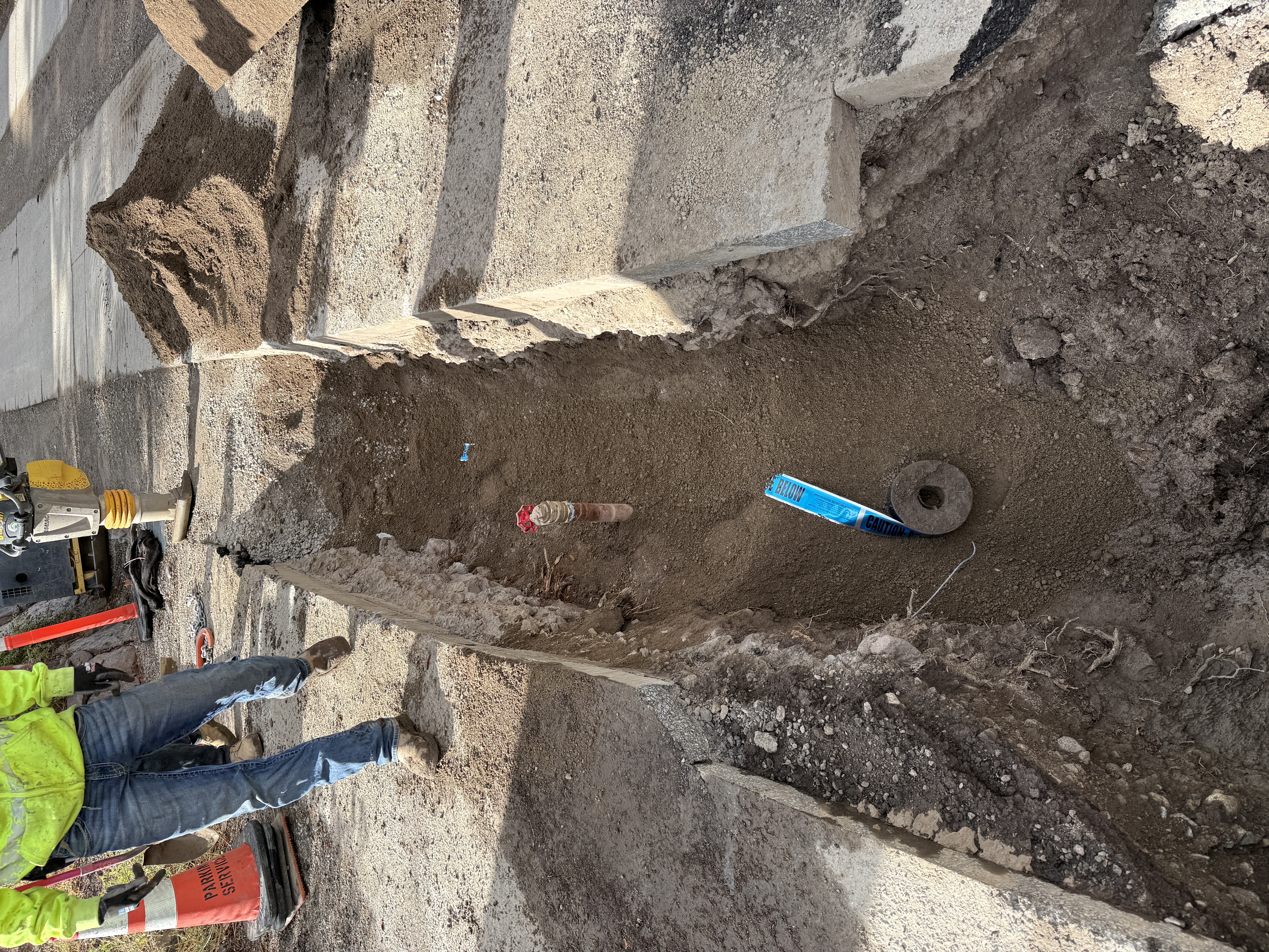An open trench is present with traffic cones for visibility, and a worker in PPE is visible.