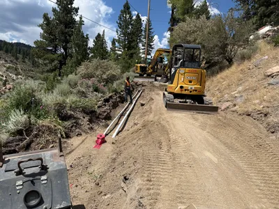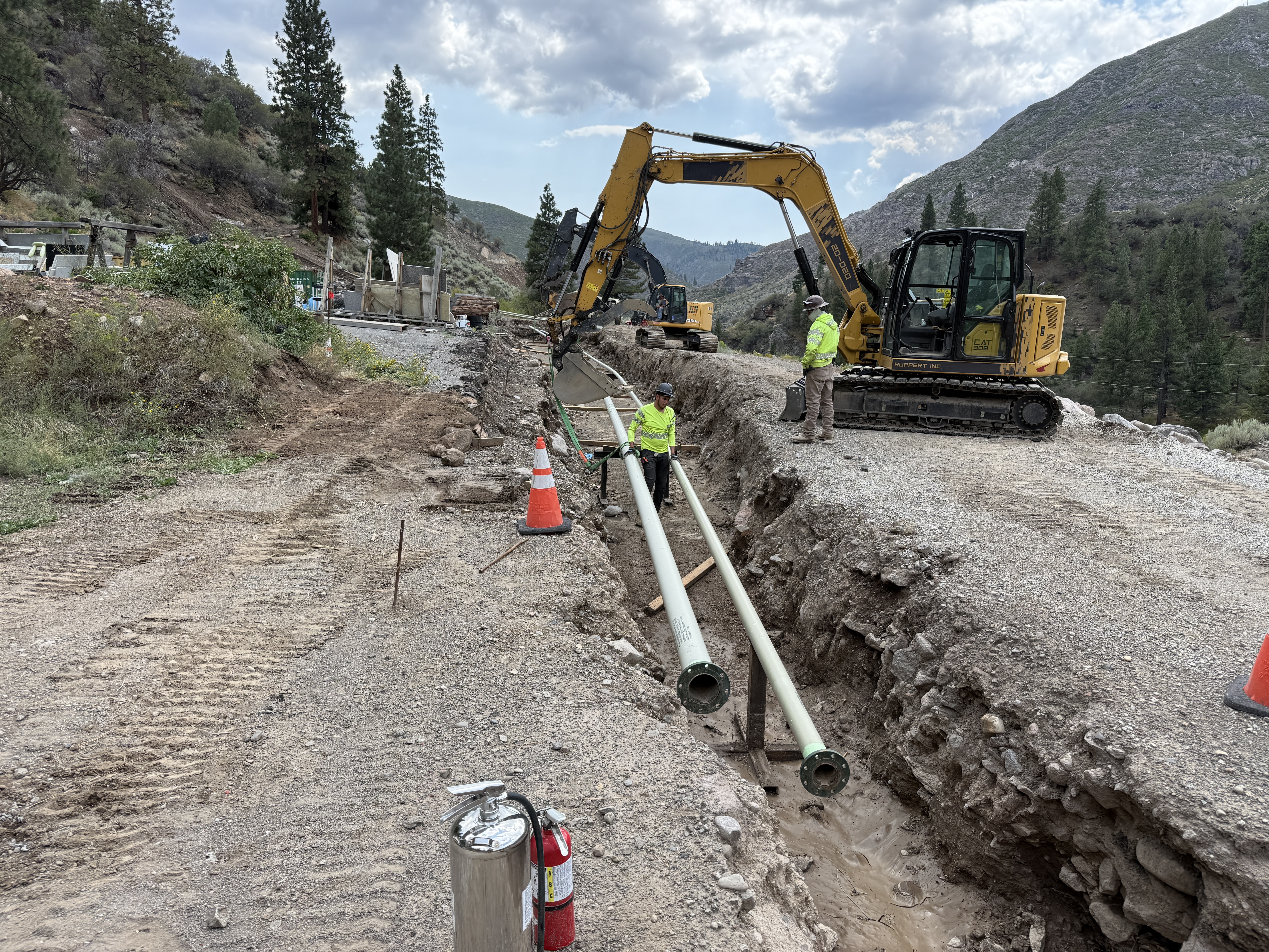 The image depicts a trenching activity where a trench is being excavated. Two workers are present, one inside the trench and another on the side. There are two pipes visible laid parallel inside the trench. An excavator is positioned near the trench, and traffic cones are used for visual cues. A fire extinguisher is also seen near the trench edge.