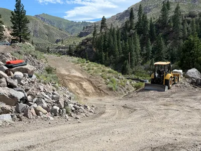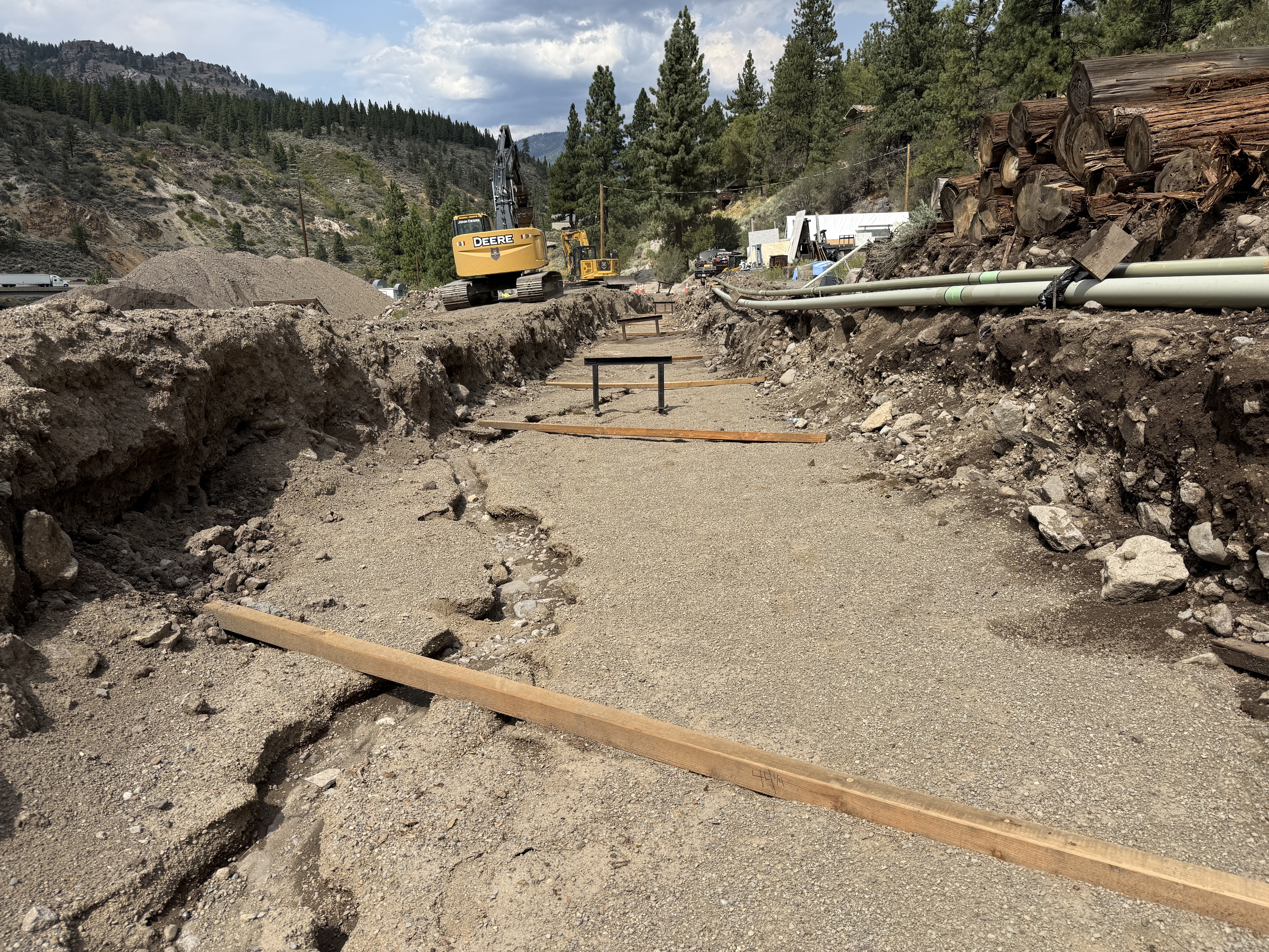 loose rocky soil partly cloudy daylight equipment and materials staged along the trench