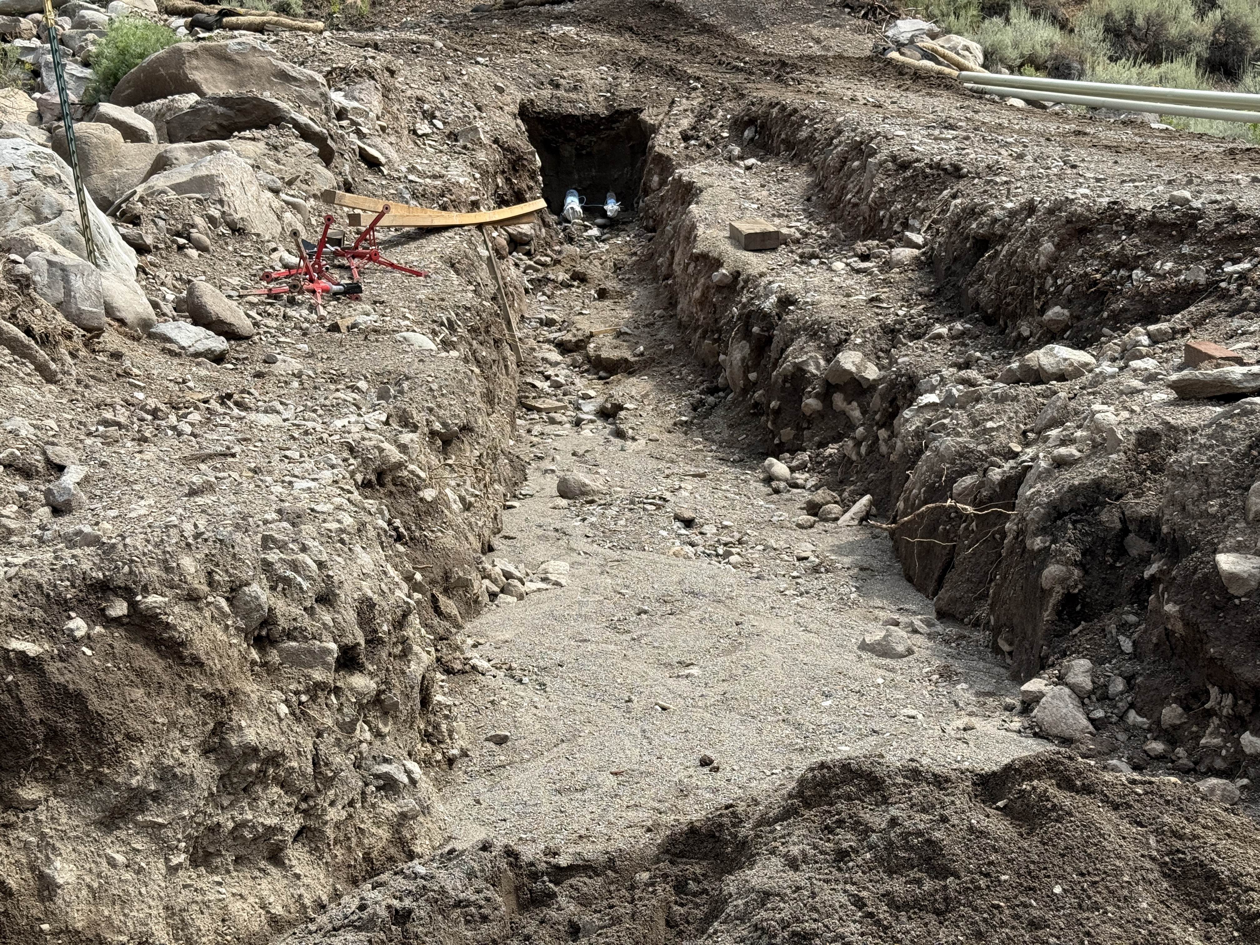 rocky soil and loose soil with an open trench cloudy lighting, no direct sunlight visible trench area is accessible but uneven