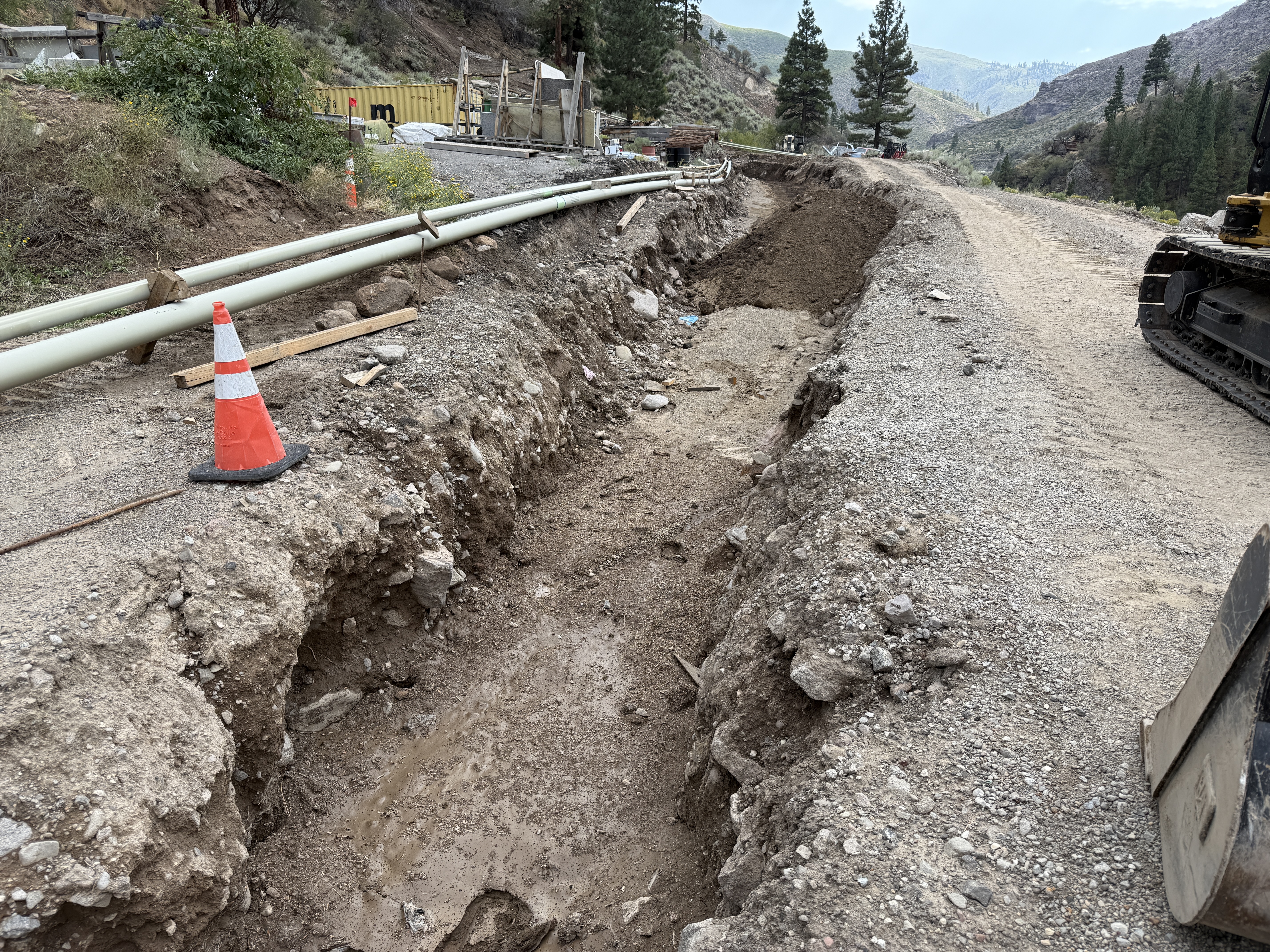 The image depicts an open trench with a soil embankment on both sides. Several pipes are positioned parallel to the trench on the left side. A cone marks the edge of the trench, and a portion of heavy equipment is visible on the right. The surrounding area has vegetation and offers a view of the distant hills.