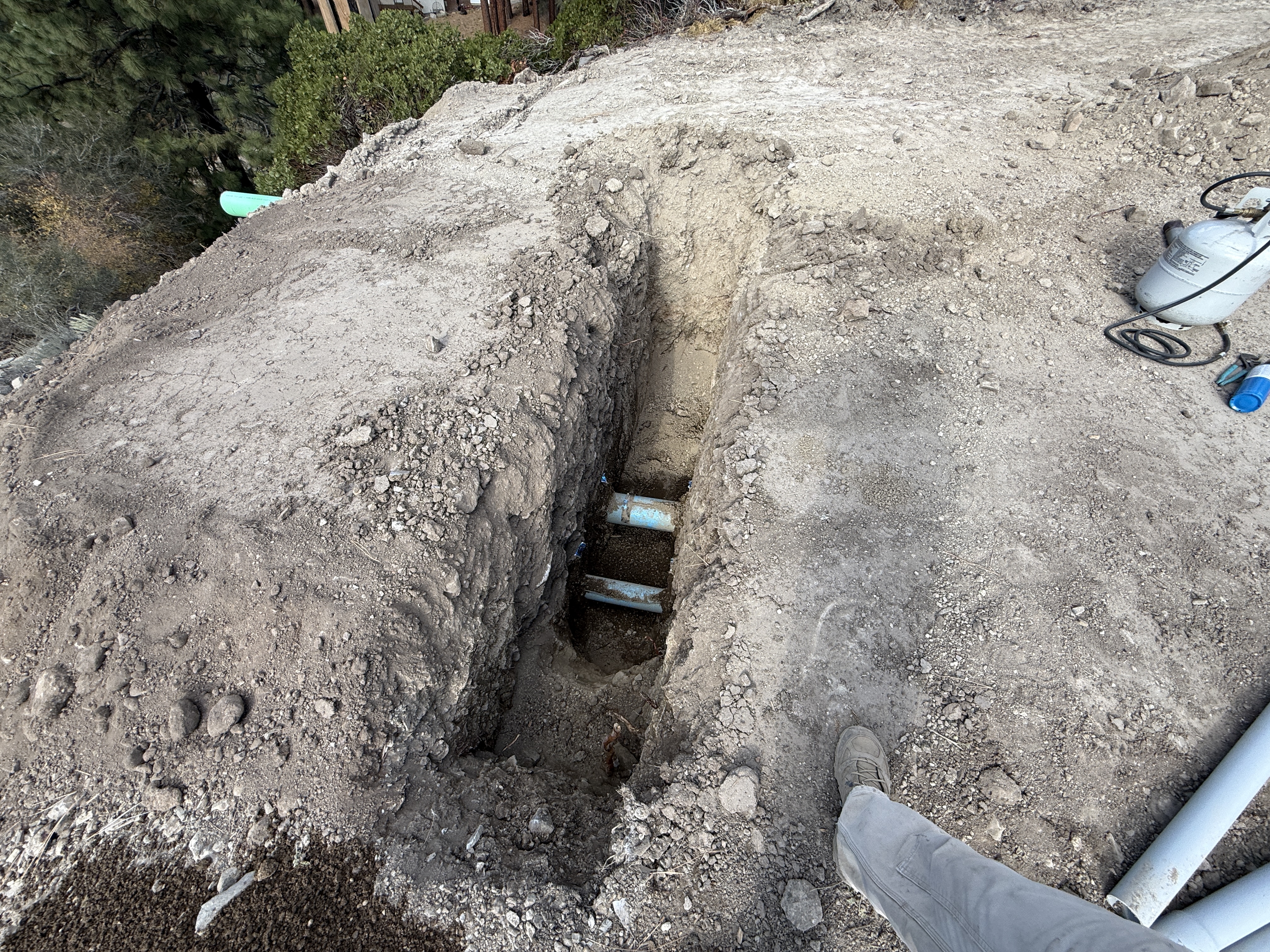 The image shows a trench dug into the ground with two visible sections of piping laid within it. The surrounding area is covered with dirt, and a gas canister is nearby. The trench appears to be part of ongoing work, potentially for water or pipeline installation. There is no heavy equipment directly in the frame.