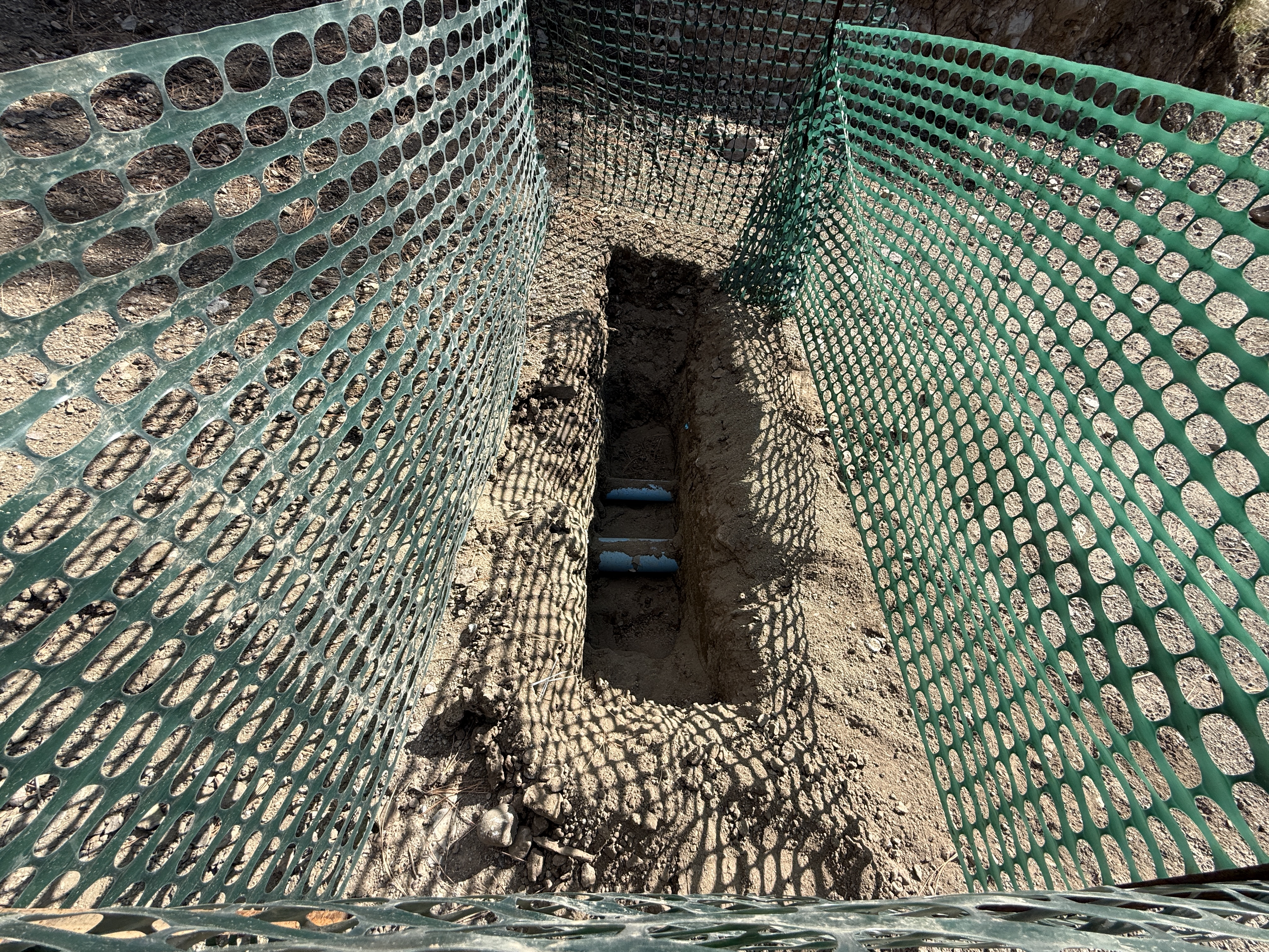 The image shows a trench protected by a green plastic mesh fence, running parallel to the length of the trench. Within the trench, two blue pipes are visible, partially buried in the dirt. The area appears to be freshly excavated with loose soil surrounding the pipes. No personnel or heavy equipment are visible, but the trench area is defined clearly by the fencing.