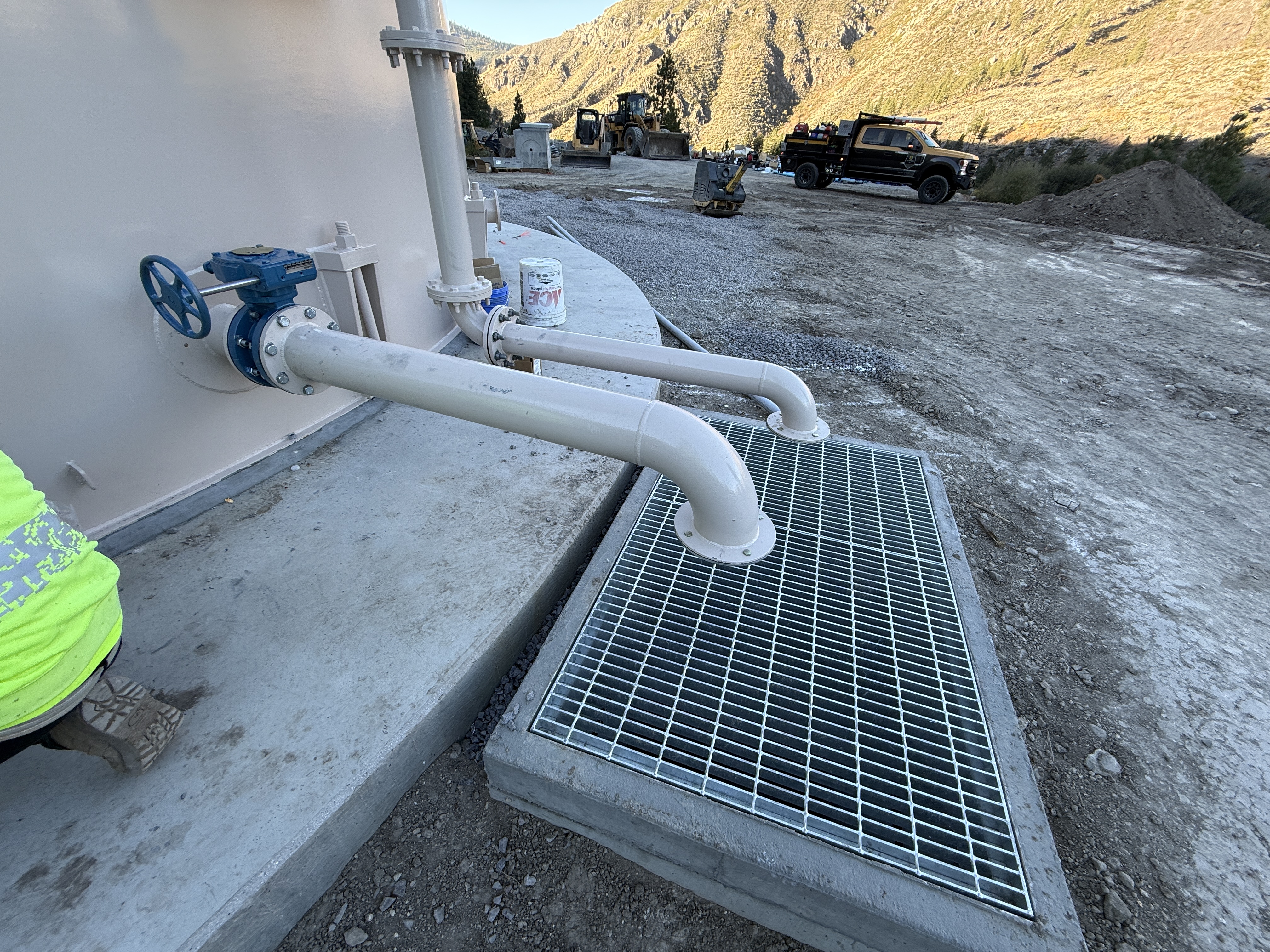 Two overflow pipes from a finished water tank are shown leading to a grated area. The image includes a blue hand-operated valve attached to one of the pipes. The setup is located outdoors with vehicles and equipment in the background. The scene suggests recent or ongoing mechanical work around the overflow system.