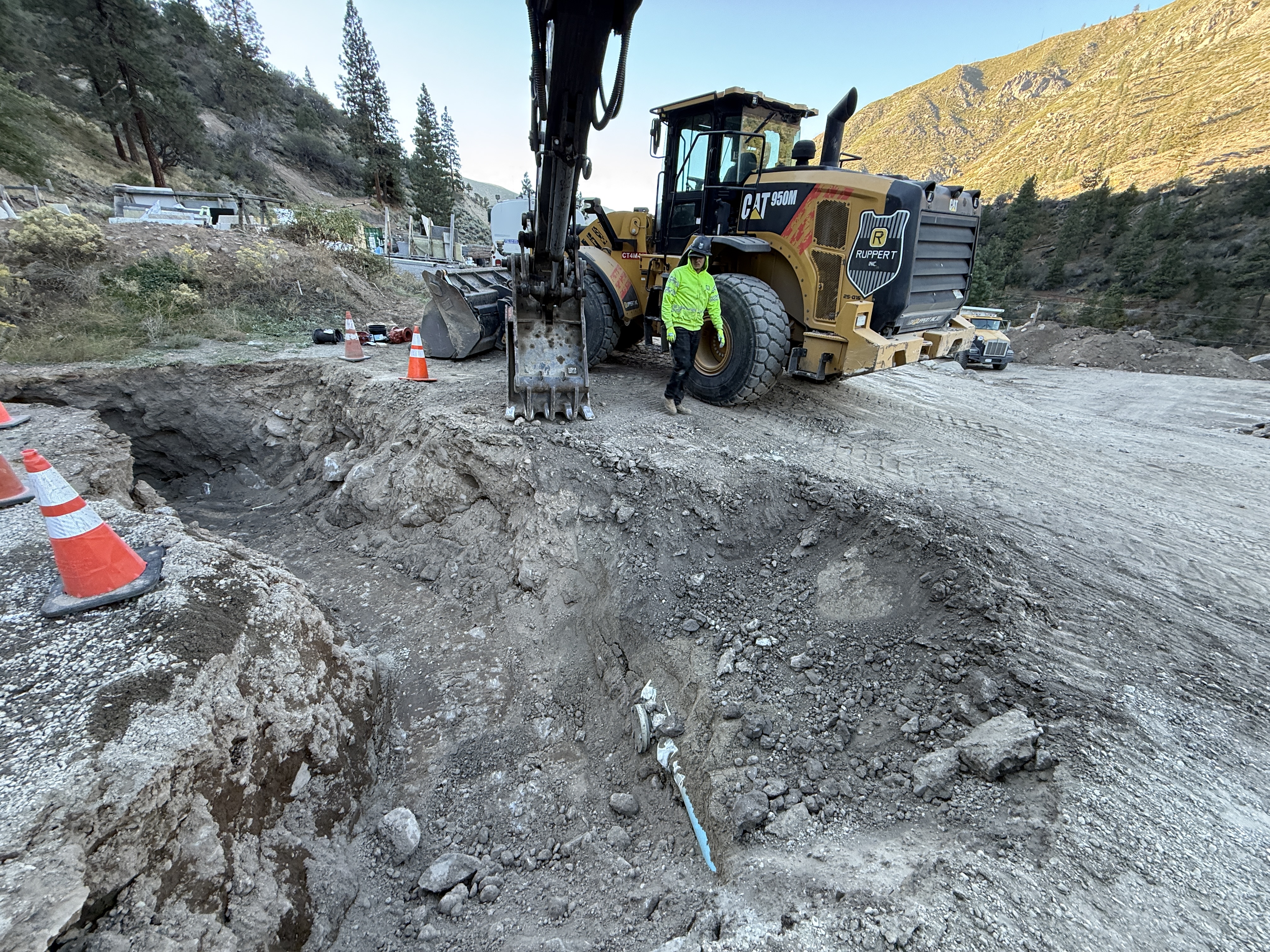 The image shows a construction site with an excavated trench in the foreground. A worker in high visibility gear is standing next to a large backhoe on the right side of the image. Traffic cones are placed around the trench, indicating a work area. Loose soil and some rocks are visible in the trench, with a pipe partially exposed at the bottom. The setting appears to be in a mountainous area with trees in the background.