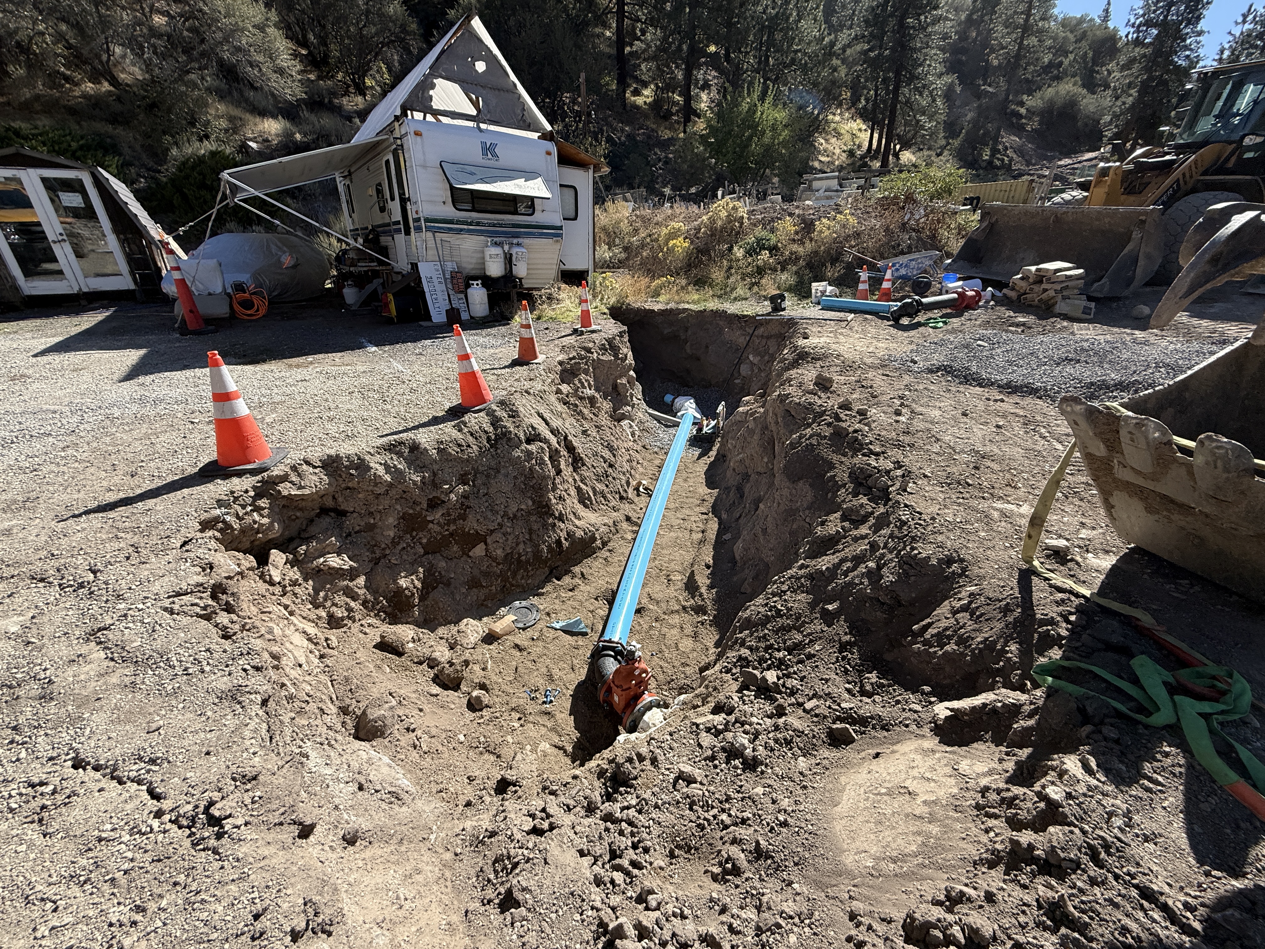 The image shows a trench at an excavation site with a blue pipeline being installed. Several traffic cones are placed around the trench for safety. There is a construction vehicle positioned nearby, and a camper-like structure is visible in the background. The trench is surrounded by gravel and dirt, suggesting active excavation work.