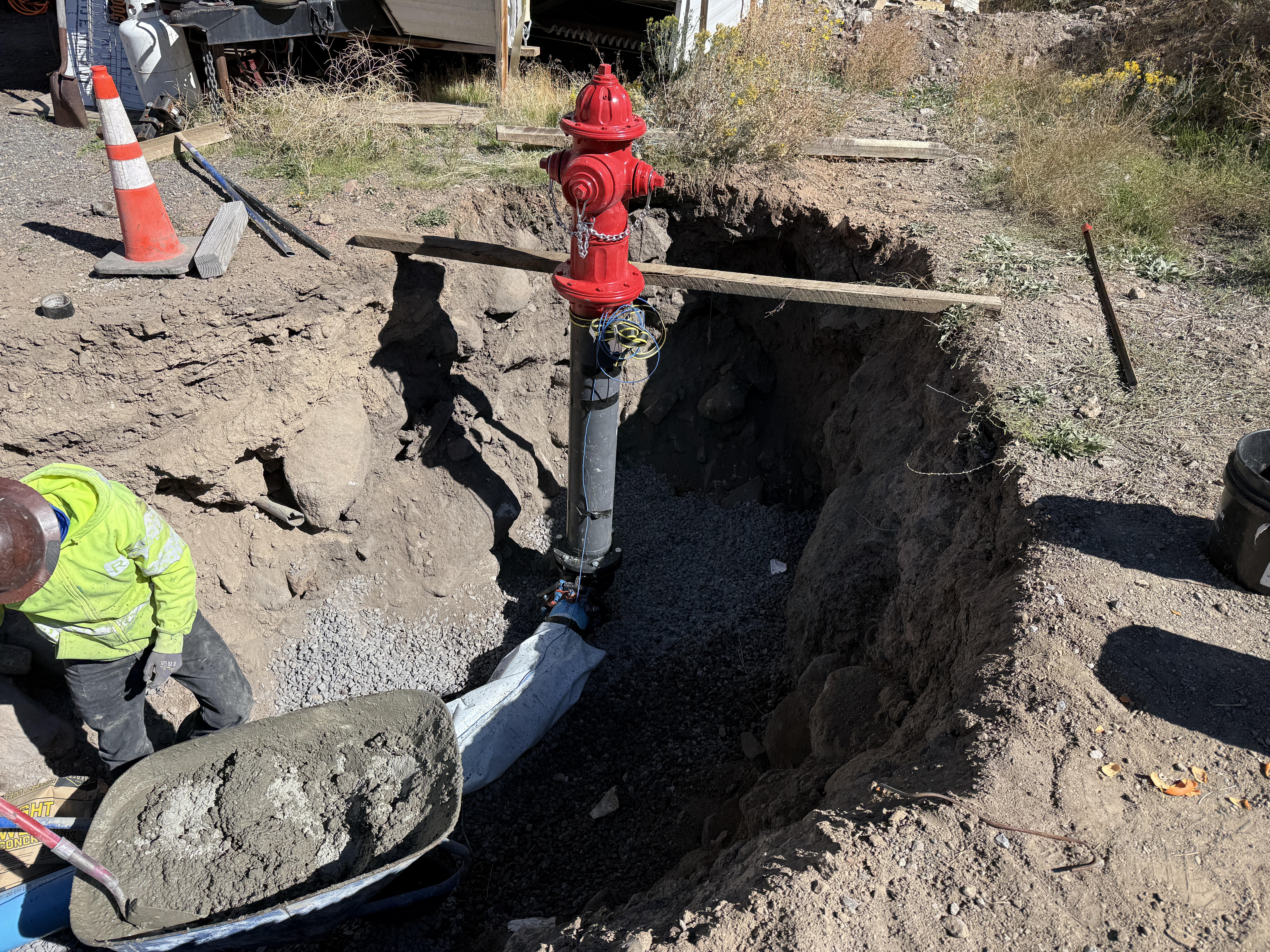 The image shows a fire hydrant being installed in a trench supported by gravel at the base. A construction worker is pouring concrete from a wheelbarrow around the base. A traffic cone is placed near the trench as a safety measure. The piping connected to the hydrant is partially visible, suggesting ongoing installation work.