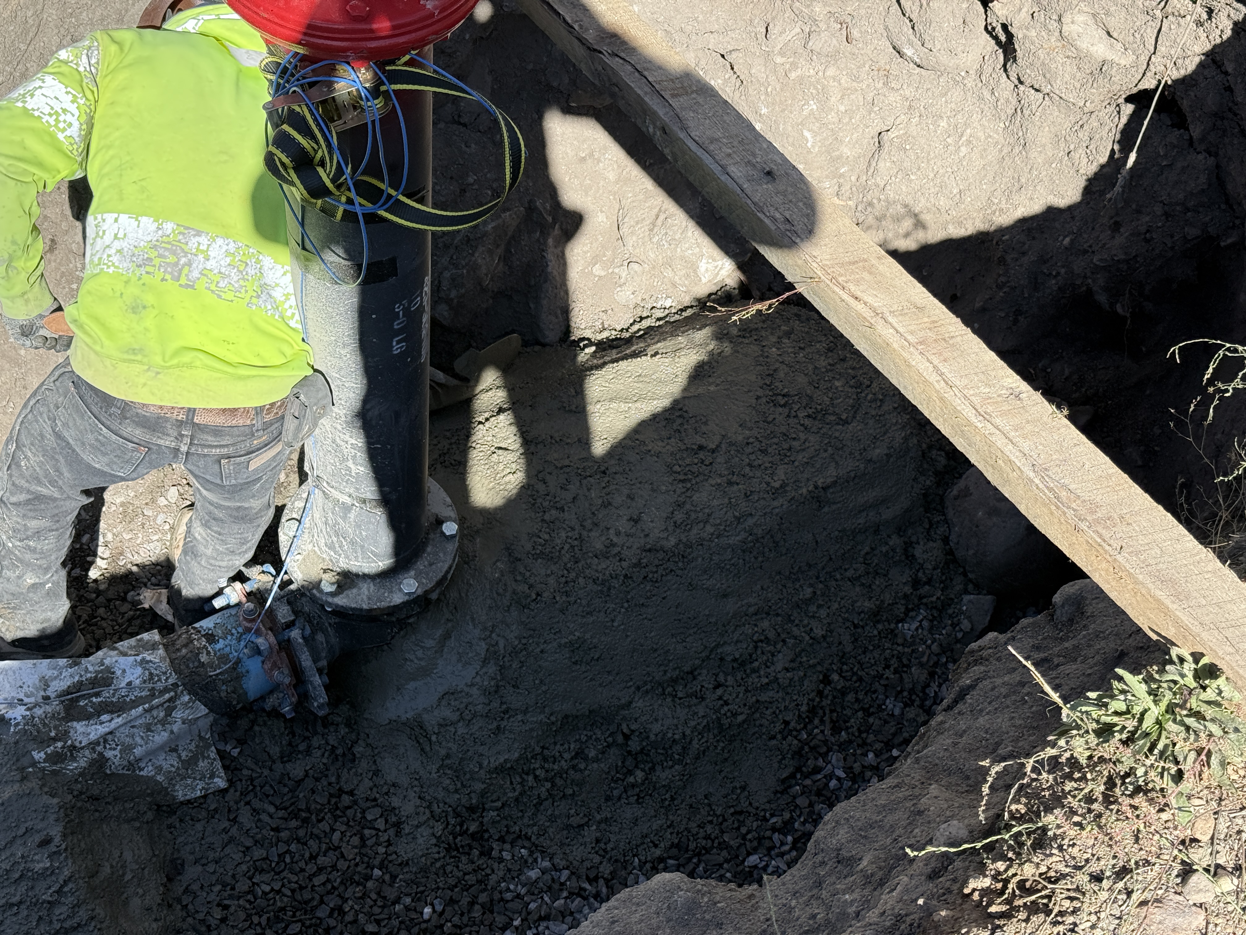 The image shows a worker in a bright green shirt near a vertical pipeline section that appears to be newly placed or secured. The area around the pipe base is filled with aggregate material and concrete. Wooden bracing is visible across the trench, providing stability. A wire or hose is connected to the pipeline, and the worker is handling it, suggesting ongoing adjustments or alignments.