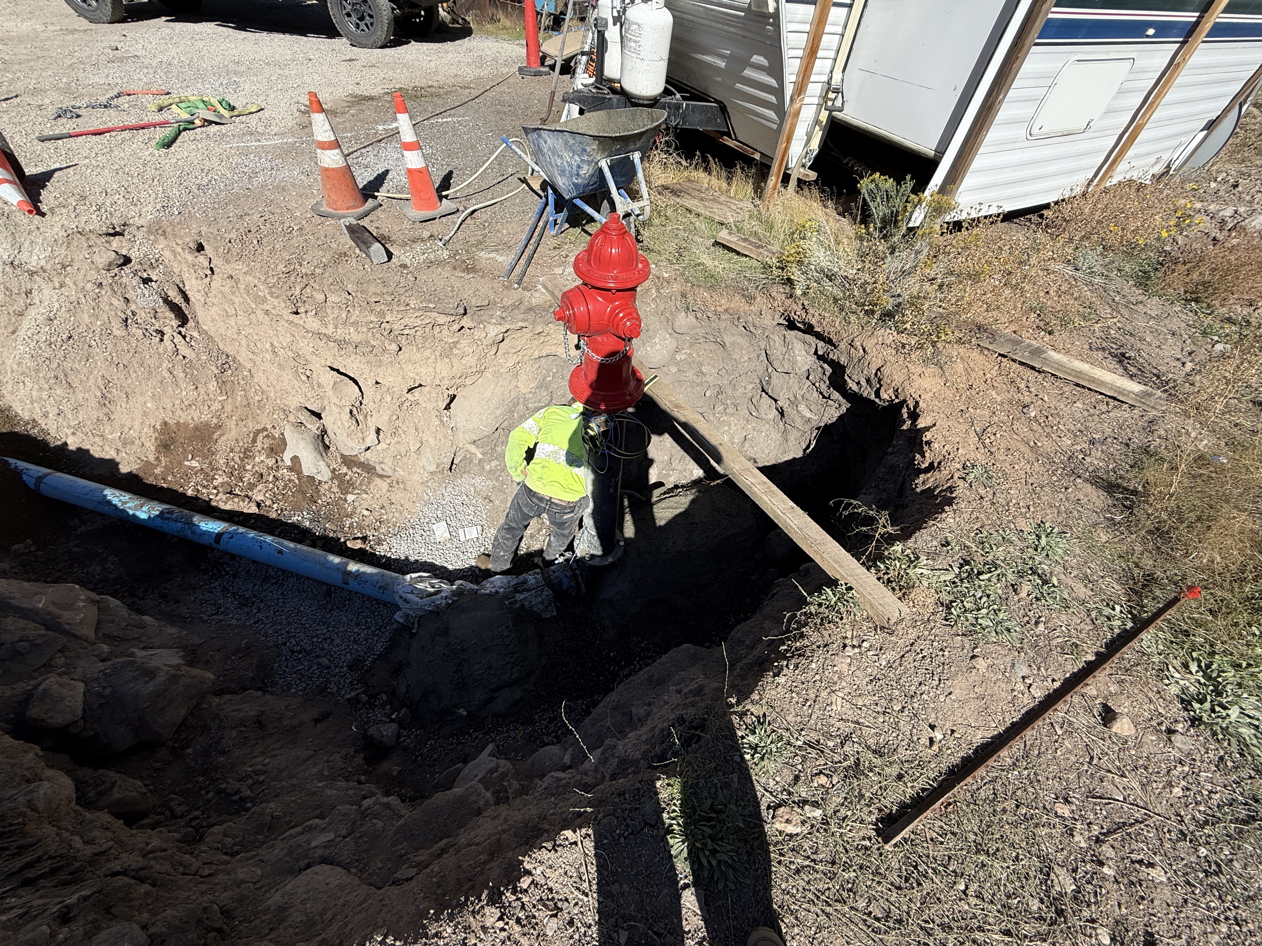 A worker in safety gear is positioned next to a newly installed red fire hydrant within an open trench. The area is surrounded by traffic cones, with a section of blue piping connected to the hydrant. The trench has uneven dirt walls, and there are wood planks placed across the trench edges.